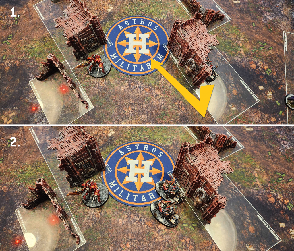 The Doom Scythes arrive and it turns out there's only one safe spot on the entire table to hide from them and that's in this corner ruin, where the walls are high enough to matter. I get shot to pieces, then the Warp Talons end up too far from the Scythe to make their charge when I get the revelation that in this mode, you have to reach the base of the Doom Scythe and not the model, a change from Hover. That's kind of on me but also fuck this game's Aircraft rules.