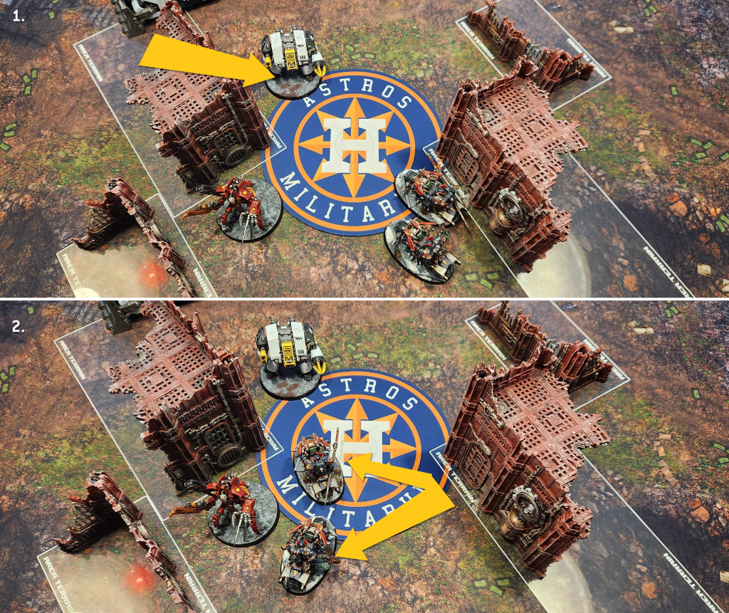 Nicolas immediately charges forward with his Scouting Triarch Stalkers. I use a reactive move with my bikes to prevent being shot at by more than one of them, then it gets off a long charge into my bikes and kills one. They fall back the following turn and use their stratagem to fall back and shoot the flayed ones, killing three of them and capturing the point. Then I pick that Triarch stalker as my oath target and put the Vindicator and the Predator on it, unloading everything into it with Sustained Hits.