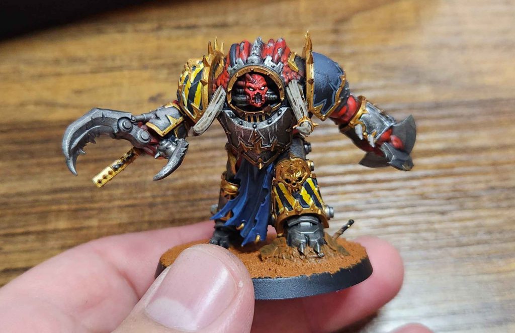 I'm really happy with how he turned out, and I'm glad I did some extra work on his base. My Iron Warriors are notably on different basing schemes from my other Chaos armies, in that they're on muddy wasteland bases painted using Blackfire Earth texture paint. I like the look this gives them but it doesn't lend itself as well to adding tufts and snow. I'm still figuring out what I want to do when I'm not adding rubble to those bases. Maybe I will do tufts; not sure yet.