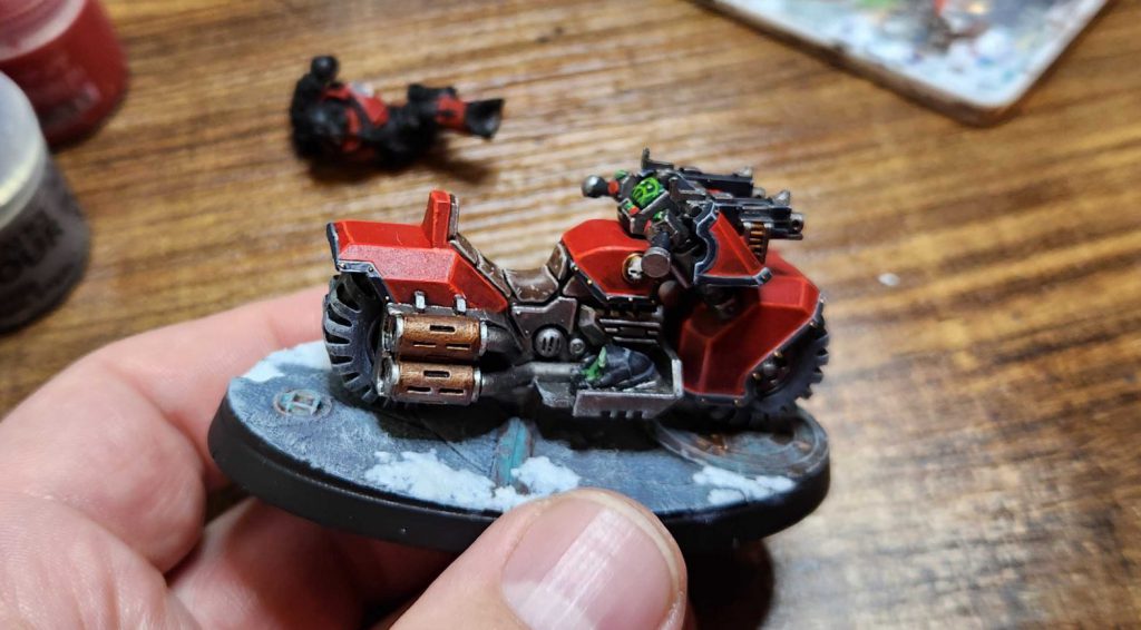 The bike itself is a great test bed for my Red Corsairs scheme - Mephiston Red shaded with Carroburg Crimson, then highlighted up to Evil Sunz Scarlet and edge highlighted with Wild Rider Red. I'm mostly doing black trim (Corvus Black, edge highlighted with Mechanicus Standard Grey), though I'll do some gold trim here and there, and any sections of black armor will most likely get gold trim.