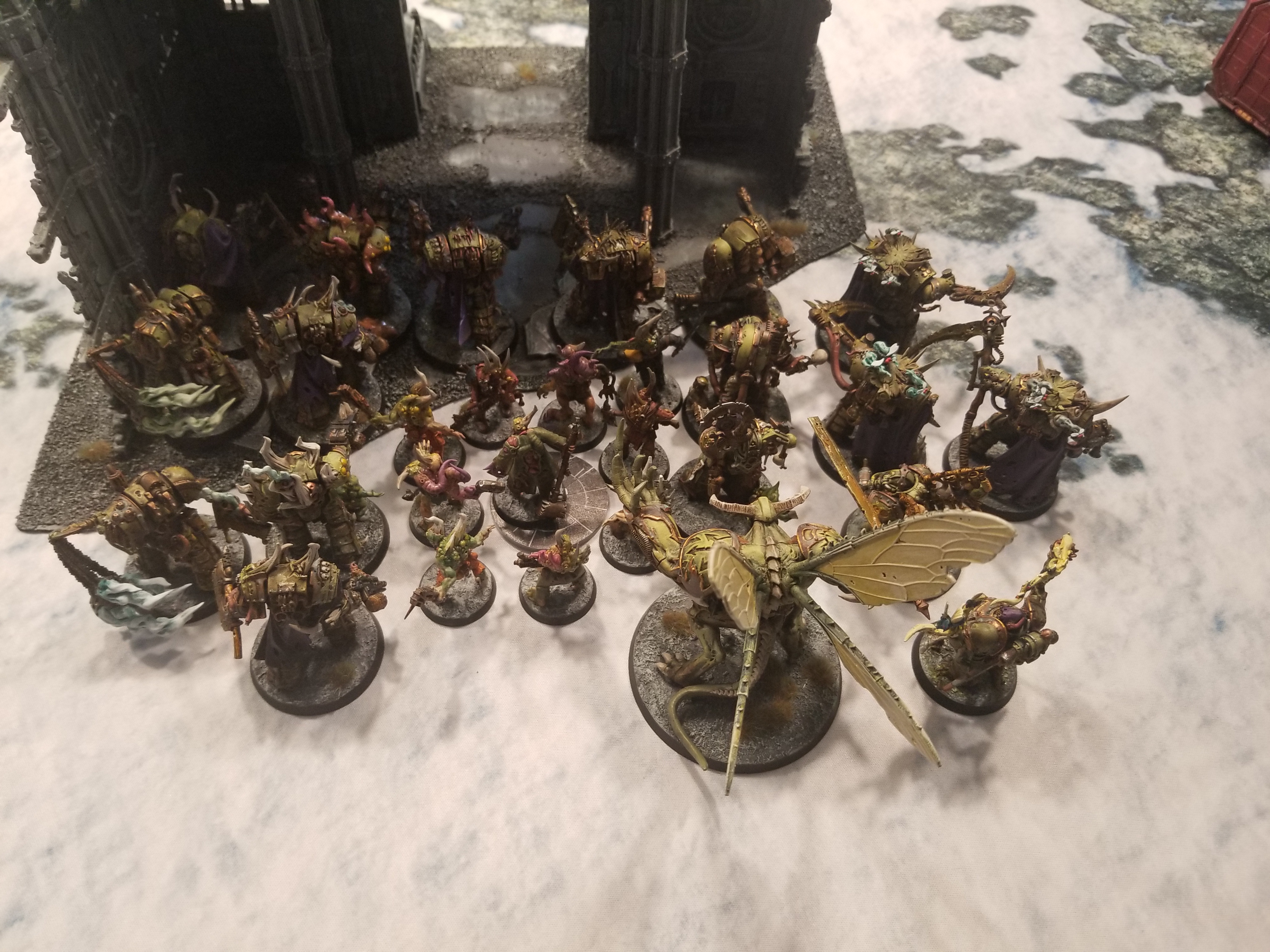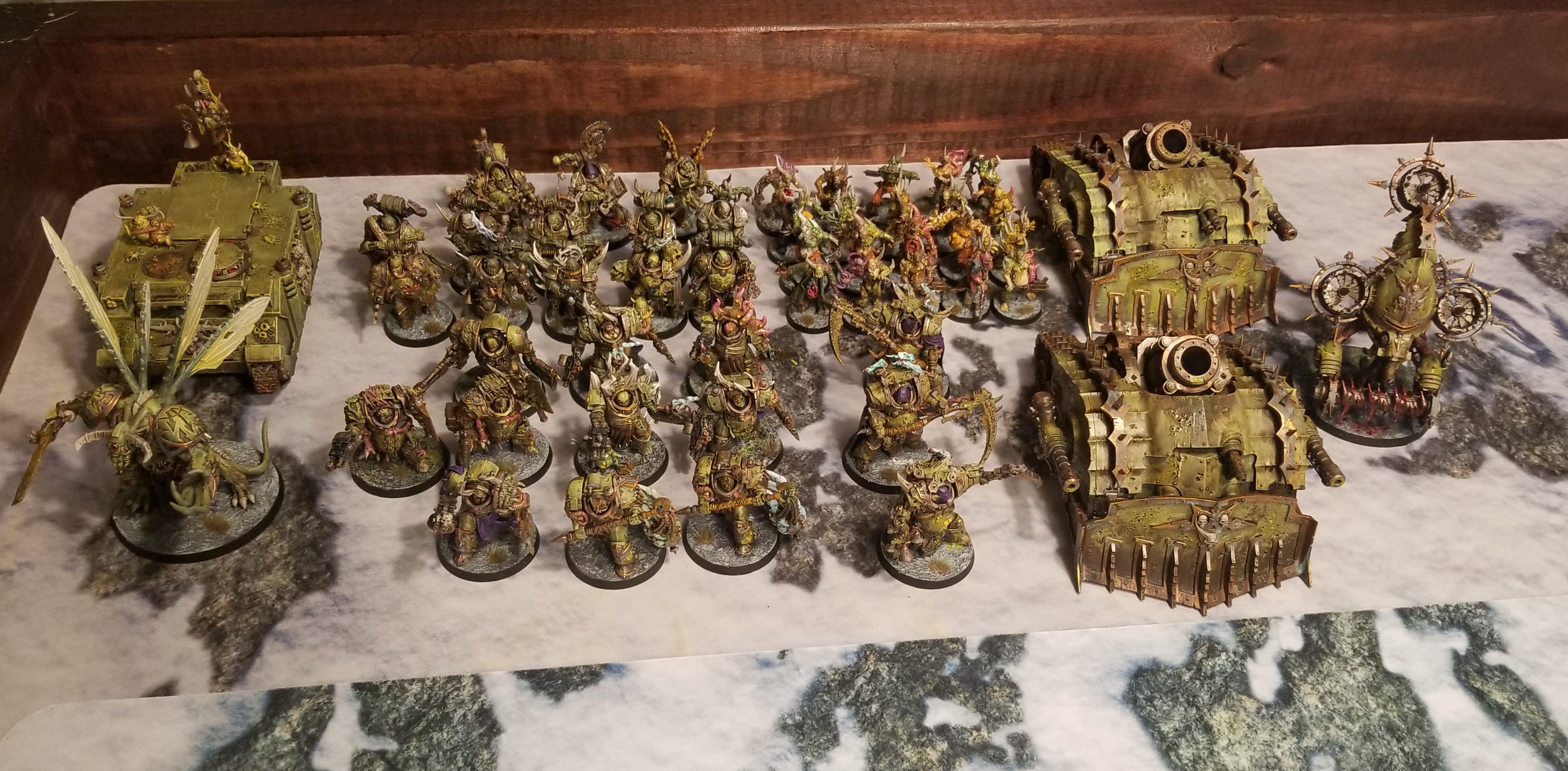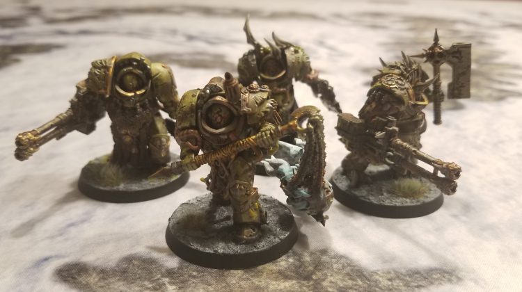 EL: Blightlord Terminators x10: 2x flail, 2x reaper autocannon + Combi-bolter, 4x axe + combi-bolter, 1x balesword + combi-bolter, Champion: Combi-bolter + Bubotic Axe, Plague Skull of Glothila (-1 CP)