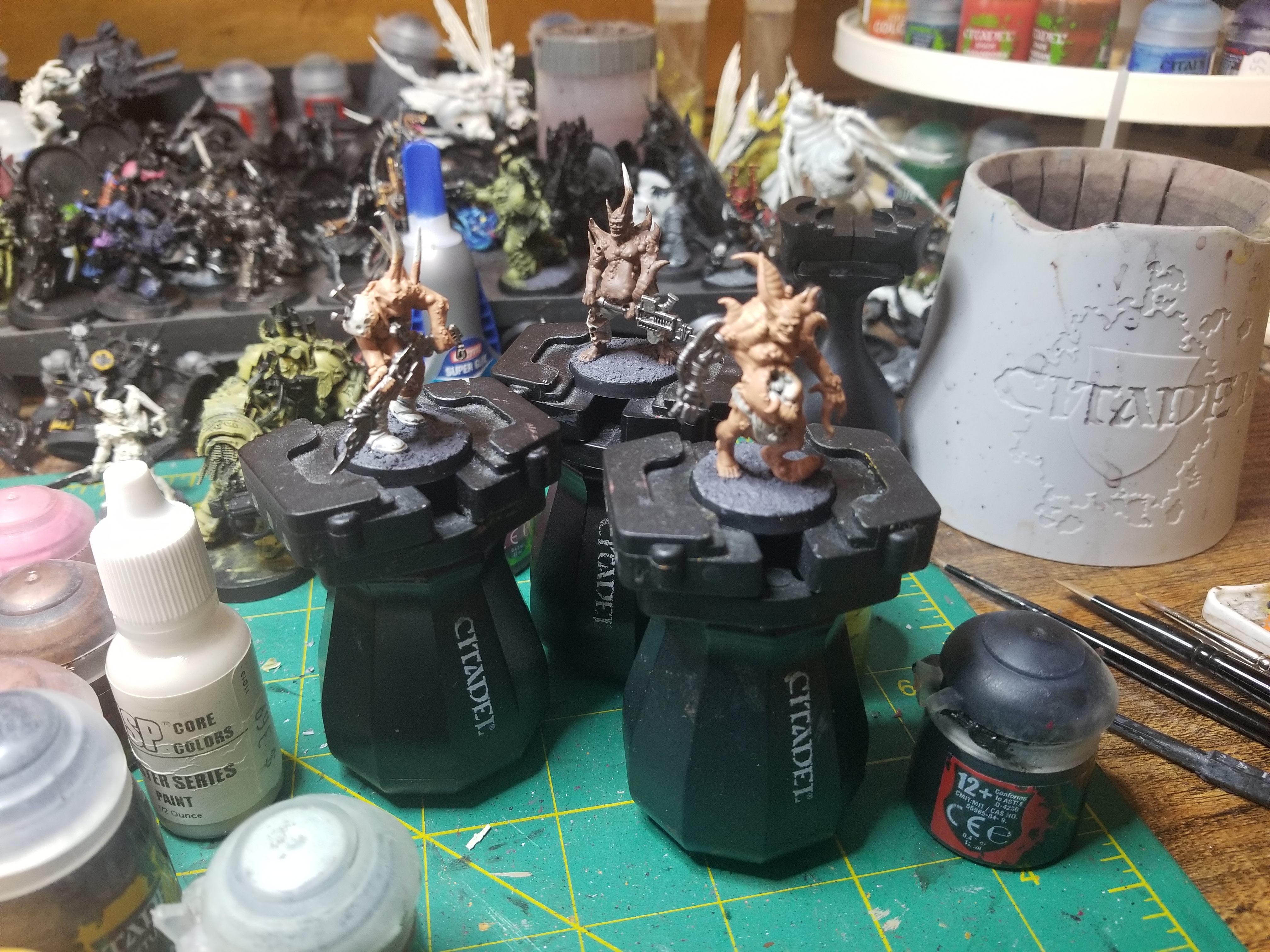 The Poxwalkers were faster to paint but I started on them later since they could also afford to be painted worse. Though in the end I'm pretty happy with them and they hold up well against my non-speed painted Poxwalkers. Maybe because I also quasi-speedpainted those. I finished the last base on the last poxwalker right as my friend Swiftblade pulled into my driveway for our practice game.