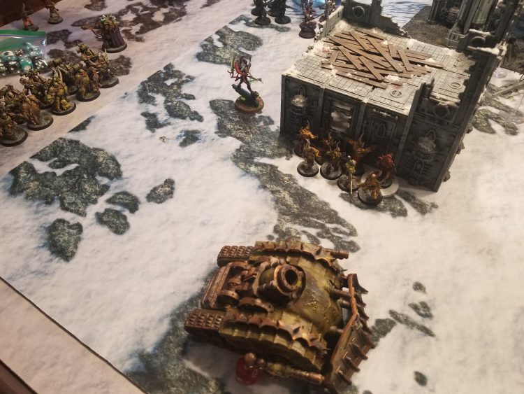 What this list brings to the table is a lot of the extremely mobile close combat threat that Drukhari excel at, with the Incubi, Wyches, and it’s four close combat monster characters, as well as some great speed with the reavers as a toolbox unit. The Cronos in Dark Creed provide a great angle to try and snipe off characters and grisly trophies on some of the raiders make for some extreme leadership debuffs that can be handy for either forcing morale or getting Tormentors to work. Before playing Rob I had tried this list against another friend of mine to great success, so the game today was about solidifying my feelings about it. Normally, I go much heavier on kabalite warriors, but swapping to a heavier focus on Wyches found success in my game earlier so I decided to stick with it and see how I felt.