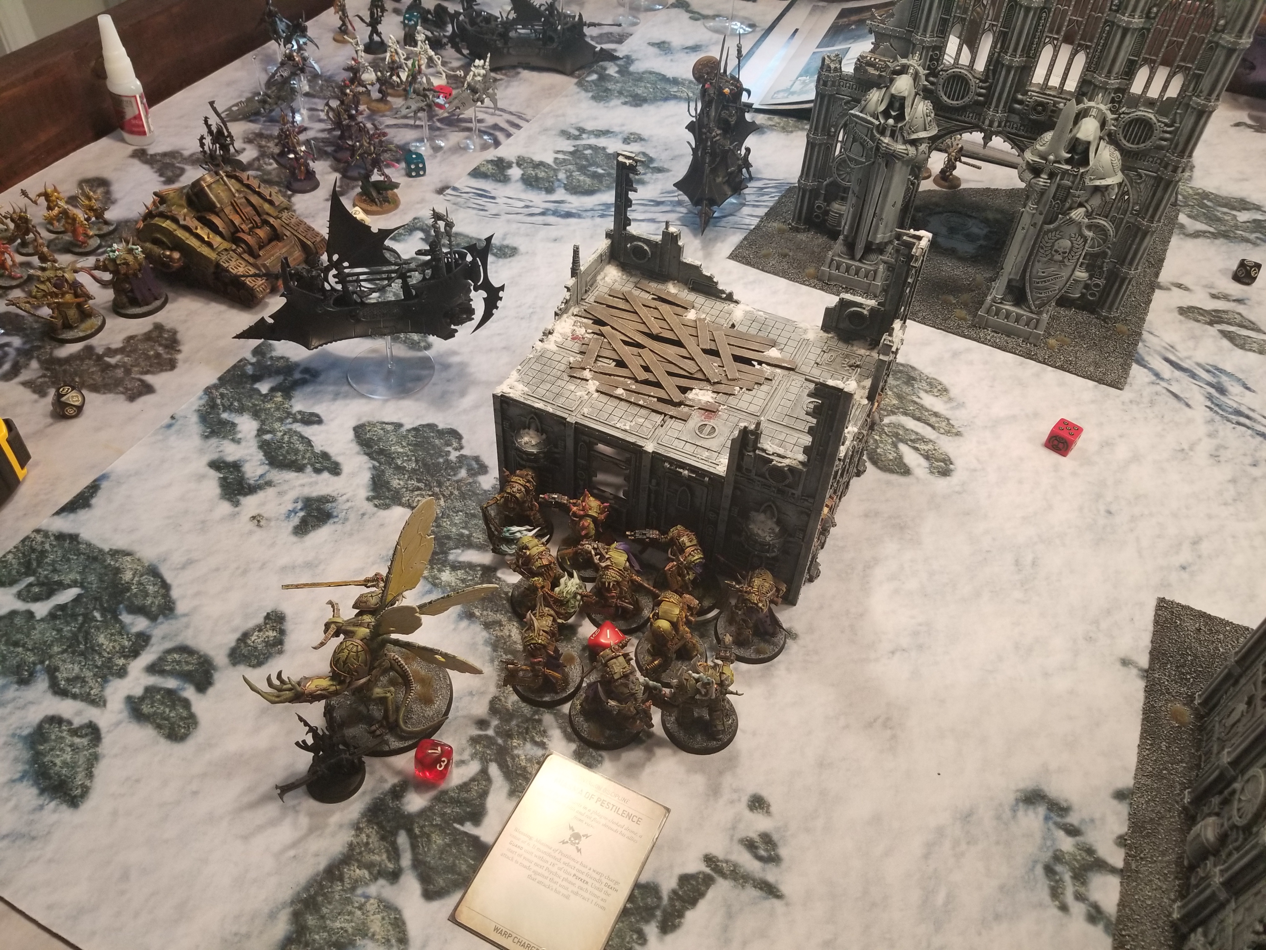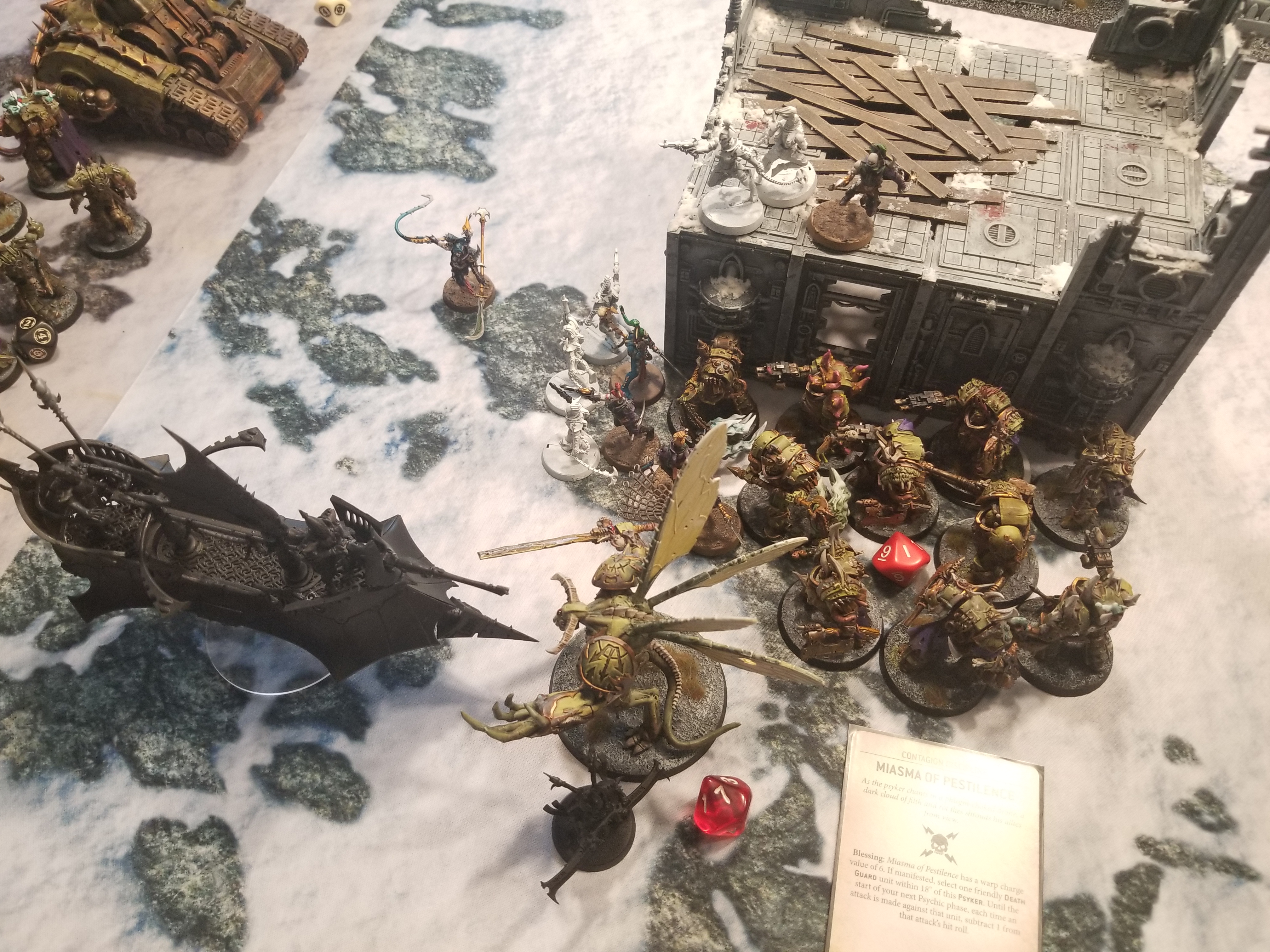 Disgusting Force, something I'm using most turns of the game to get extra splash damage off the mortar. I also end up corrupting the left objective with my poxwalkers, and lose 3 in the process. The upside is that I killed a single unit of Reavers to Swiftblade's 0, scoring me 3 points for