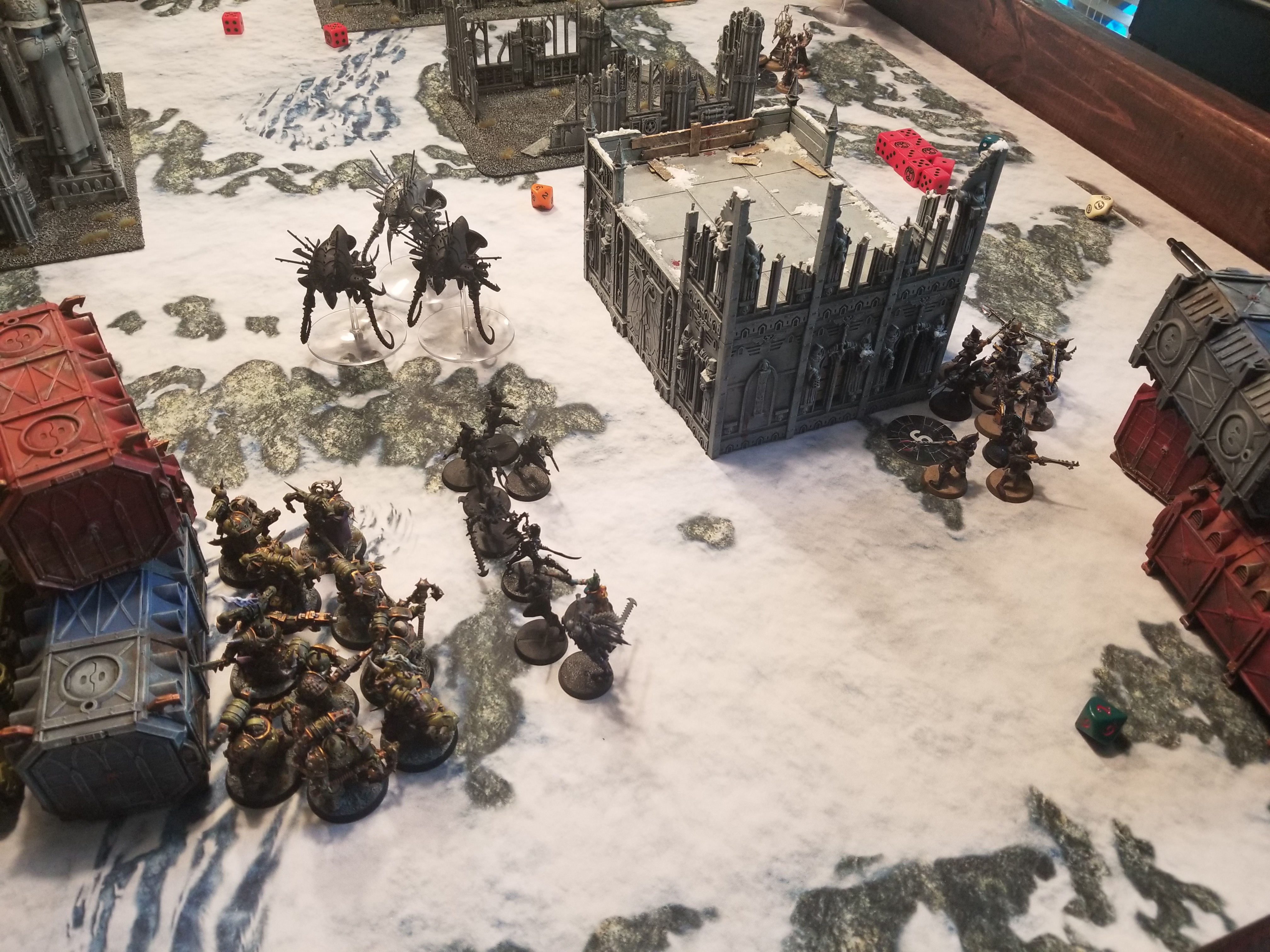 This isn't my favorite mission for the LSO terrain style, since Dawn of War deployment makes it really difficult to hide a lot of the units I needed to keep hidden to prevent getting blown off the table by enemy shooting on turn 1. I dropped my big ruin in the middle of the table and tried to pile some of the other ruins as best I could around the other two objectives. The plan was to split my PBCs on either side of the table and then have my big death star of blightlords in the middle of the table. Swiftblade split his army on either side, giving him lots of room to flank around the edges of the table with raiders, in a similar move to what Archon Skari talked about in our