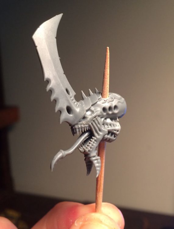 When hobbyists depict a character being run through by a weapon, they'll often cut the weapon and glue piece a on each end to give the illusion of impalement. While this can work, being even the slightest bit off makes the whole thing look wonky. And even if you do it perfectly, it's easy for things to snap off after gluing. Much better to do it right - in this case, power-drill a hole through each head and ram a cocktail stick through. What a rush! Almost like dispatching heretics yourself.