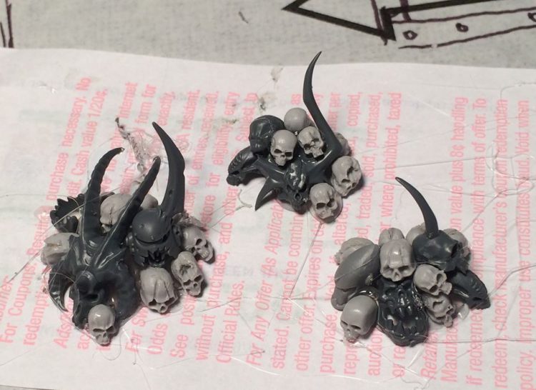 Each skull mound started life as a blob of hot glue deposited on a receipt via glue gun. Quickly, before cooling, the desired skulls and helmets were pressed into the blob. For larger mounds, a second blob was placed on top and a smaller second tier of skulls attached. Any gaps or open areas had additional skulls carefully placed with tweezers and a tiny dab of hot glue. Because hot glue has a short working time, it helped to have the skulls pre-arranged into the groups I wanted to assemble into mounds. If I was picking and deciding as I worked the glue would cool completely before I was done.