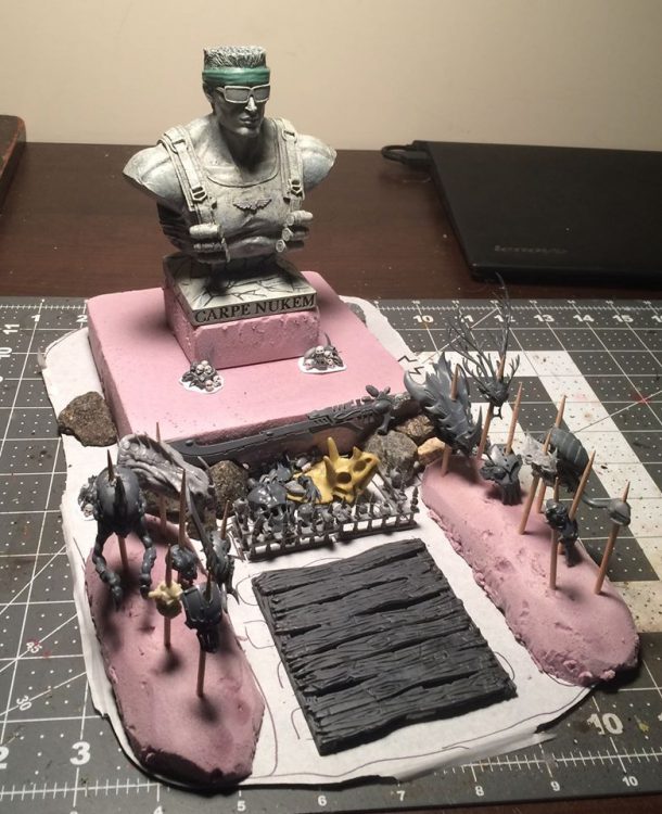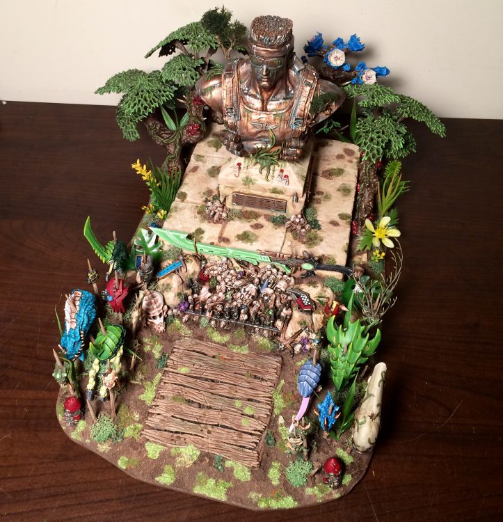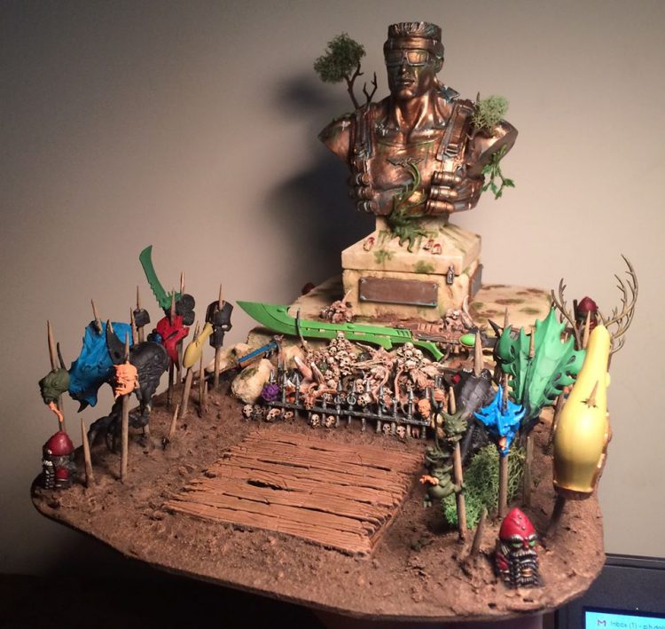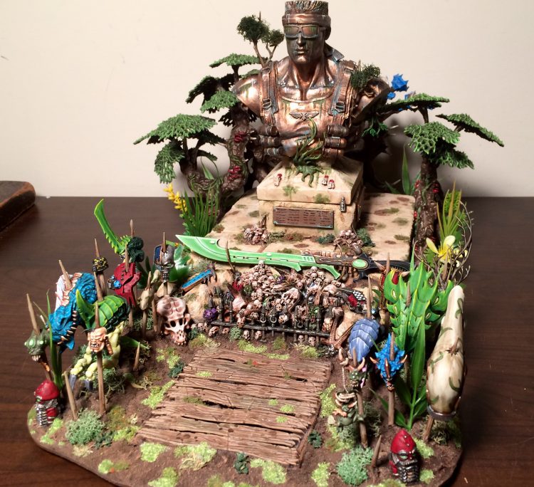The Catachan are always portrayed as ferociously loyal Imperial warriors, but not particularly pious. For years I had the idea of a Catachan shrine to the Emperor which, instead of stained glass and candles, would have trophies from slain enemies of mankind laid as tribute. What greater worship of the Emperor is there than killing in his name? The only problem was that I could never find a cheap Emperor miniature. With the Duke in hand, I decided to take the same idea but put a Catachan "tomb of the unknown soldier" twist on it instead.