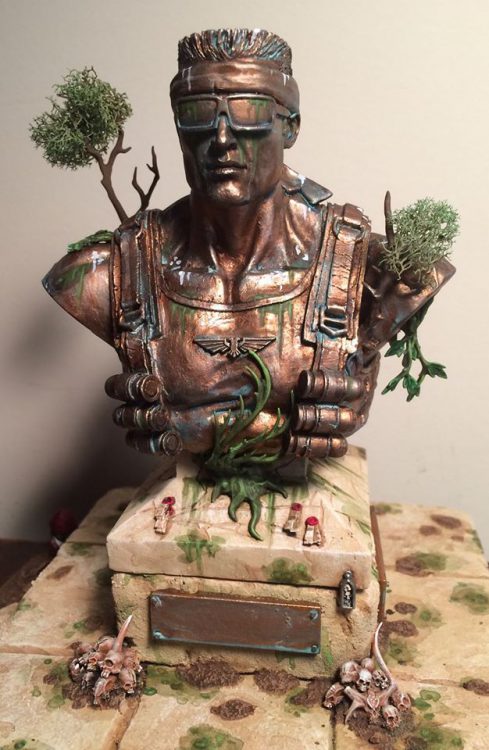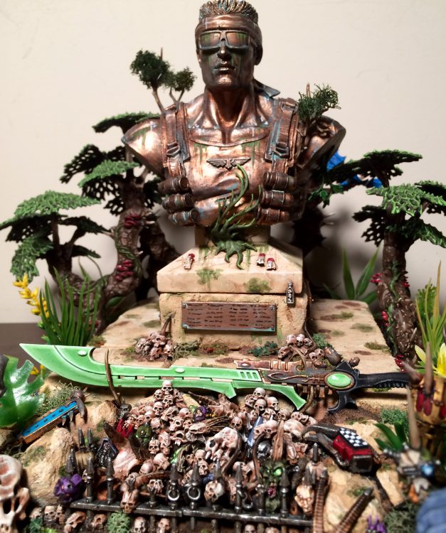 Clearly, in this terrain piece, the statue is the focal point. With the new greenstuffed bandana and Imperial Aquila, we can no longer call him Duke in good faith. I have rolled on the Kill Team Catachan Naming Table and it turns out that this was a fellow named Grytt (13 on a D66). His demeanor was Gung-Ho (10 on a D10), which is highly appropriate. Rest in Peace, Grytt.