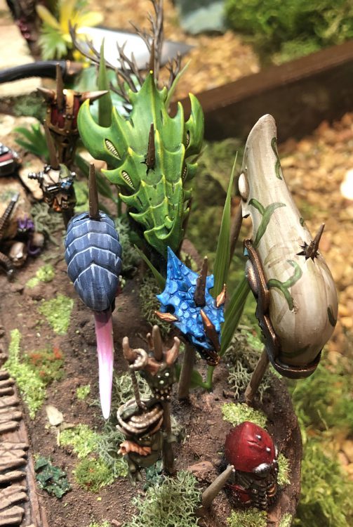 Many thanks to my buddy Brandon for the extra jungle trees - the terrain desperately needed them to truly give a jungle feel, and they make the overall composition 100x better. They were assembled, primed, and hot-glued onto the painting-in-progress model.
