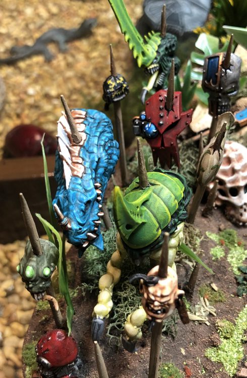 With Grytt's colors in place, as well as the stasis generators painted to match my Squat army, I began selecting colors for the impaled heads. Blues, greens, tans and reds were all safe colors that were already established in the model, so I went with them to avoid the model looking too chaotic and "noisy." Those broad selections also gave me enough latitude to accomplish another goal of the terrain... paint up as many of the heads as possible to resemble my common gaming opponent's armies. Raise your hand if you saw that coming a mile away.