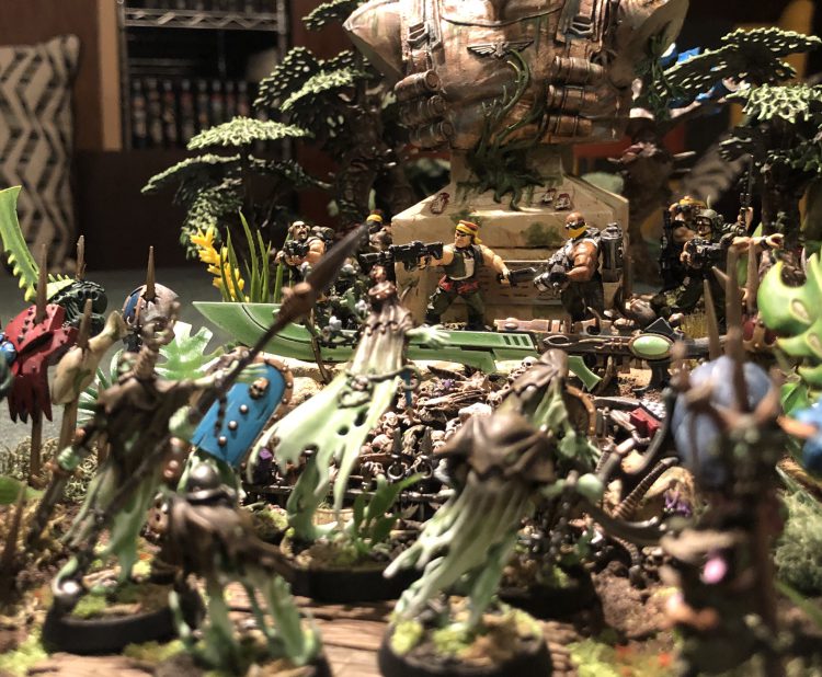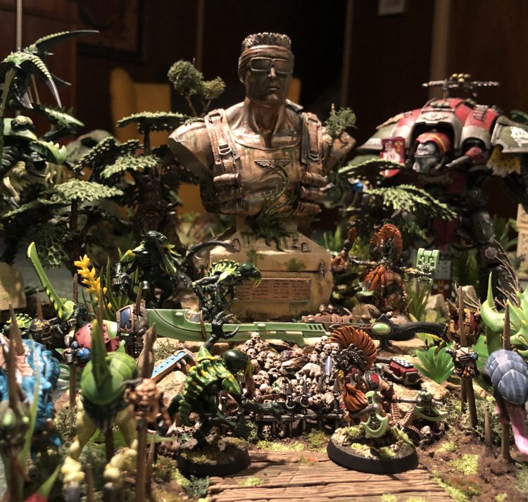 Narrative Hook: A warp storm has thinned the veil between this world and the Empyrean, causing restless souls to walk again. Waves of ghostly figures crash upon the tomb, drawn to the mounds of skulls where their own severed heads lie, seeking to tear down the monument with unearthly claws. The local Catachan mount a staunch defense of this sacred ground until the warp storm passes.