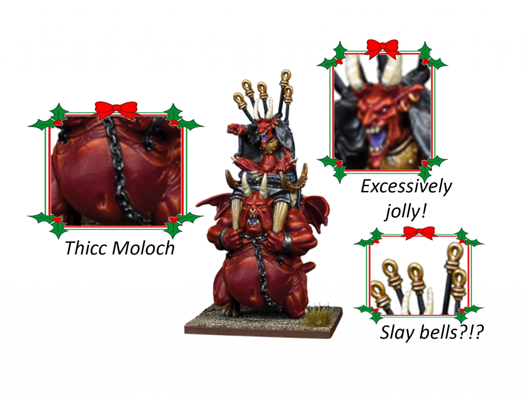 Speed: A Nimble, Speed 6 Warlock riding a Moloch at first glance doesn’t seem optimized for the rapid distribution of presents, and you’re right. But his smaller base size means he can squeeze in smaller spaces, like chimneys. 5/10