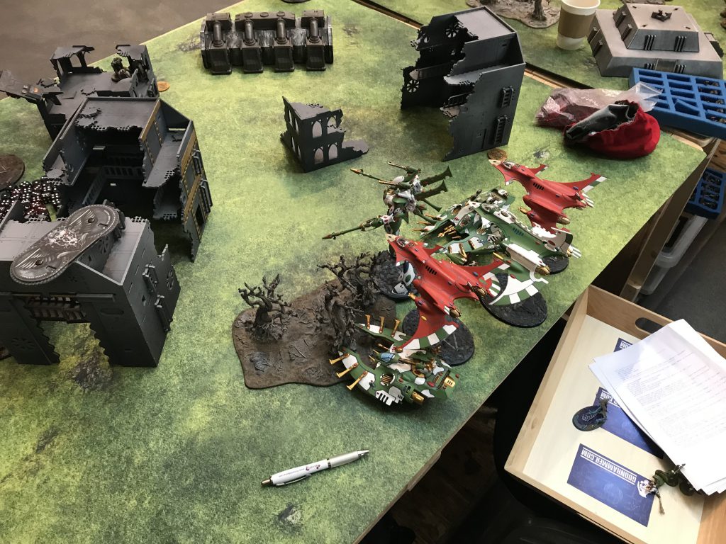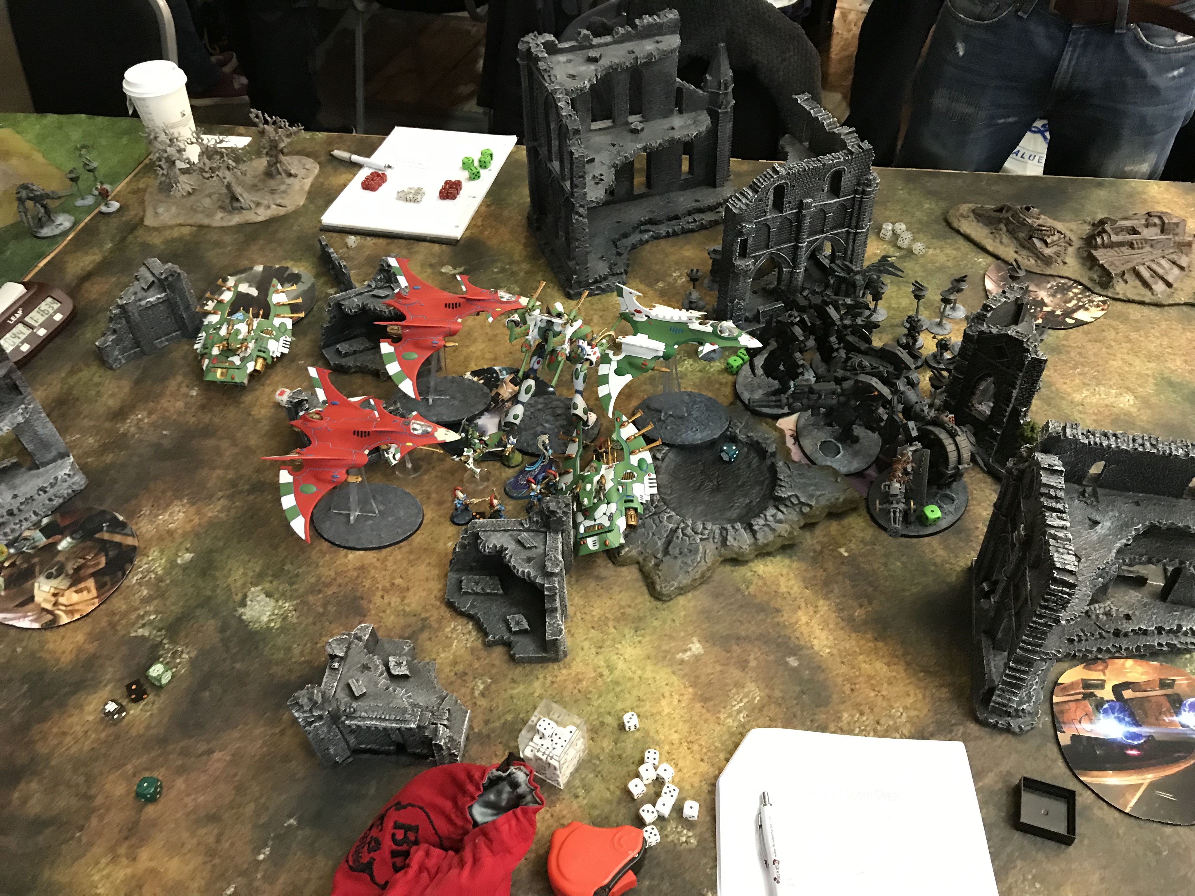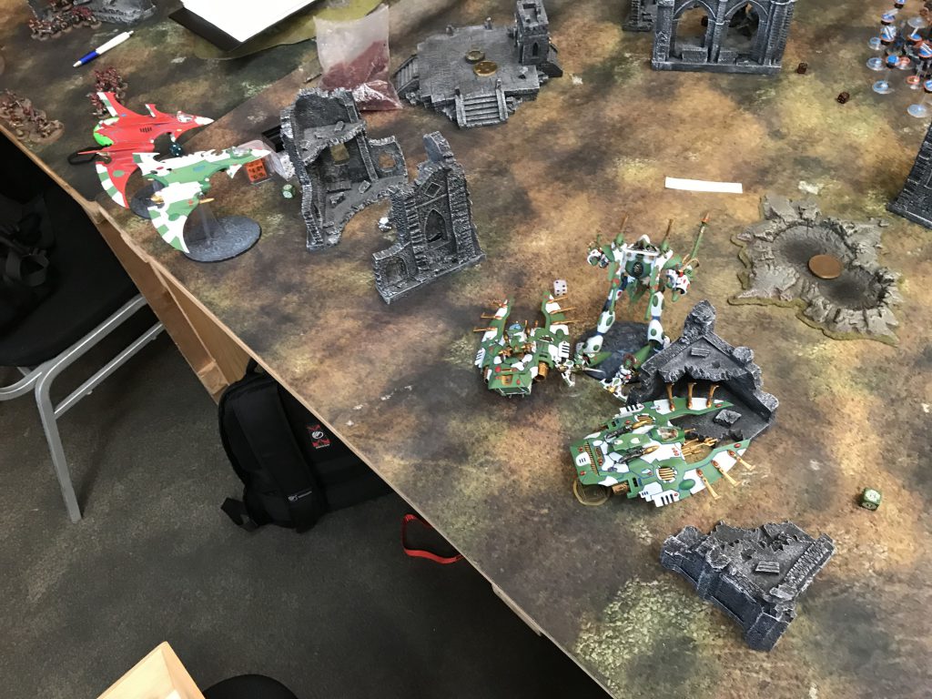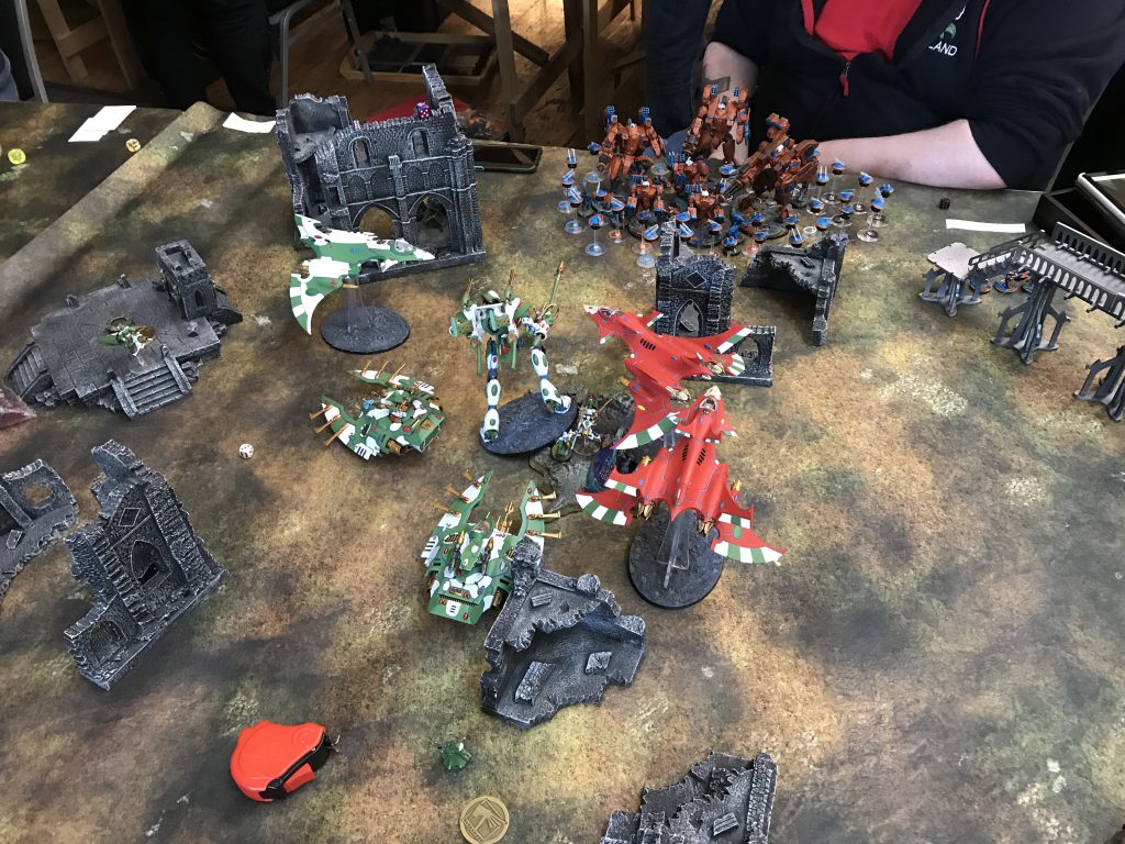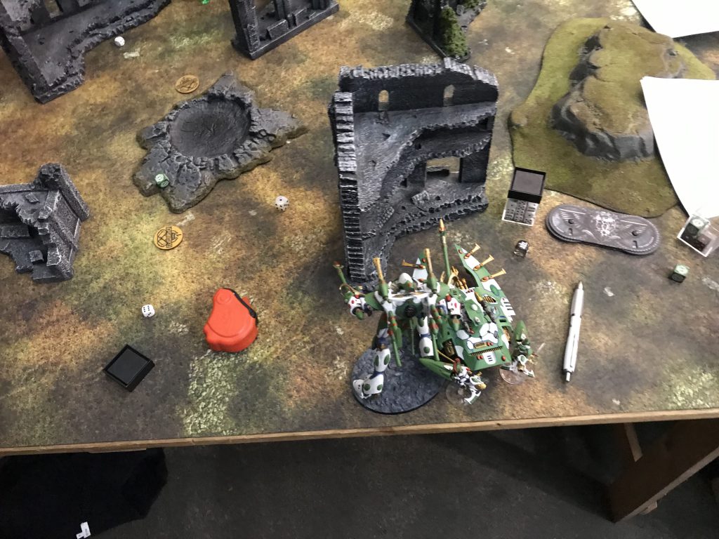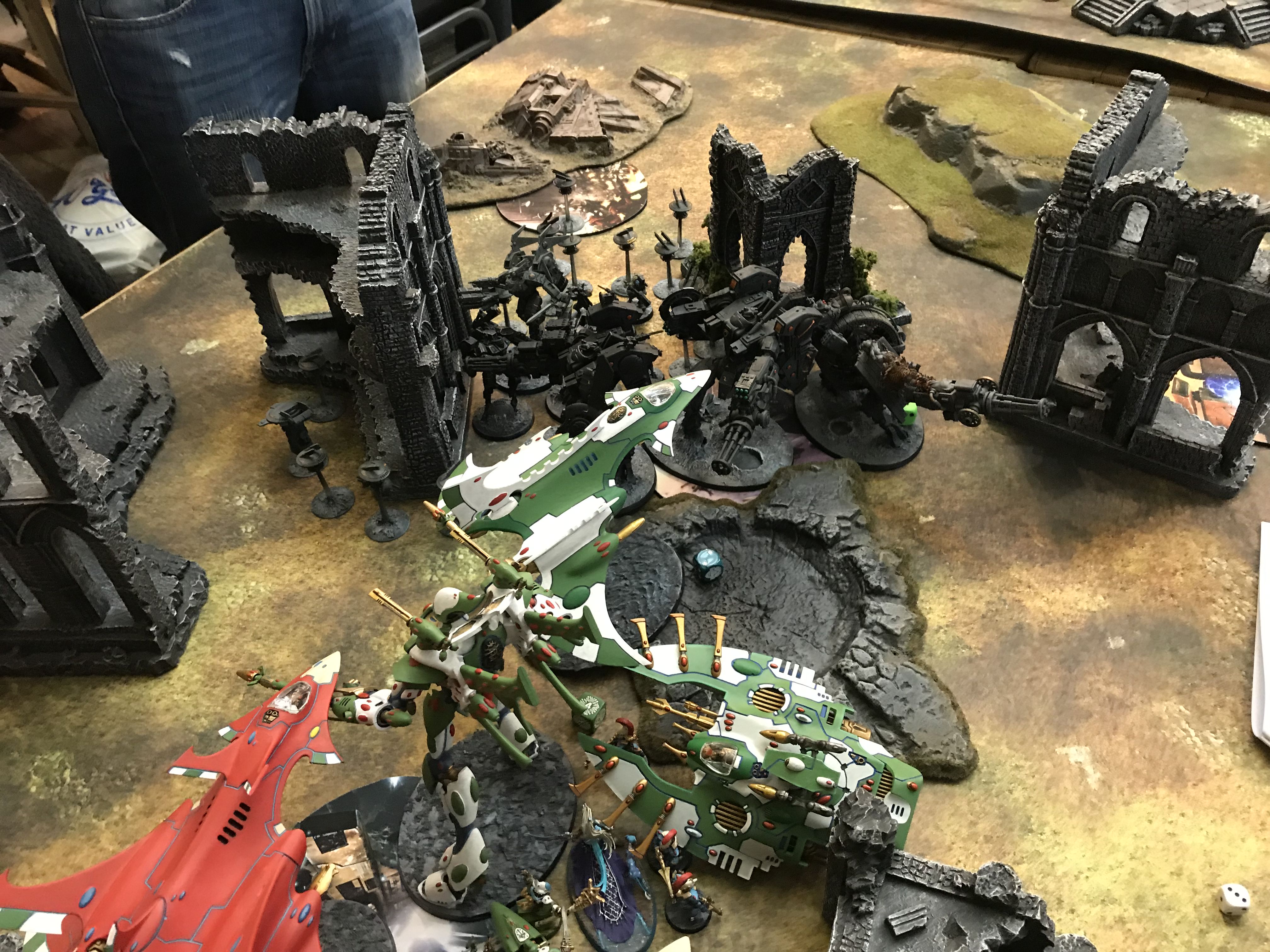 Facing down the Tau gunline (far enough back to force a move/shoot if he goes first).