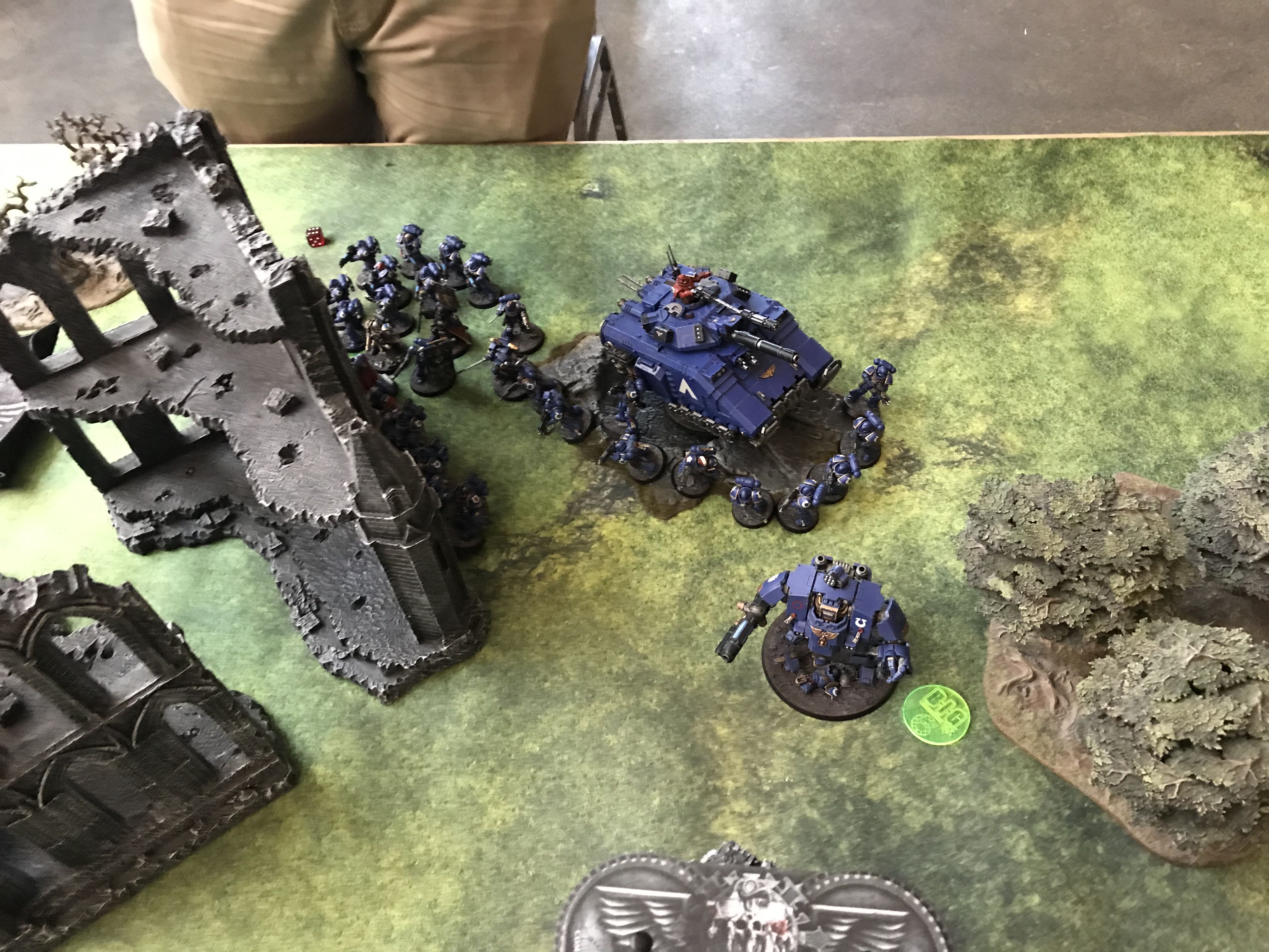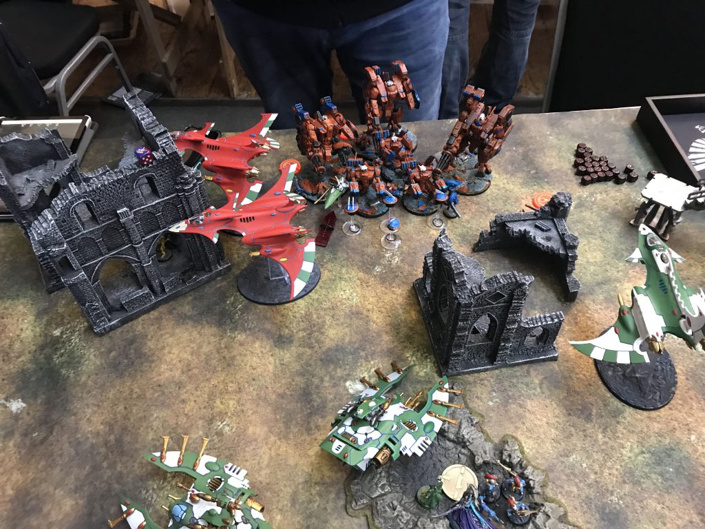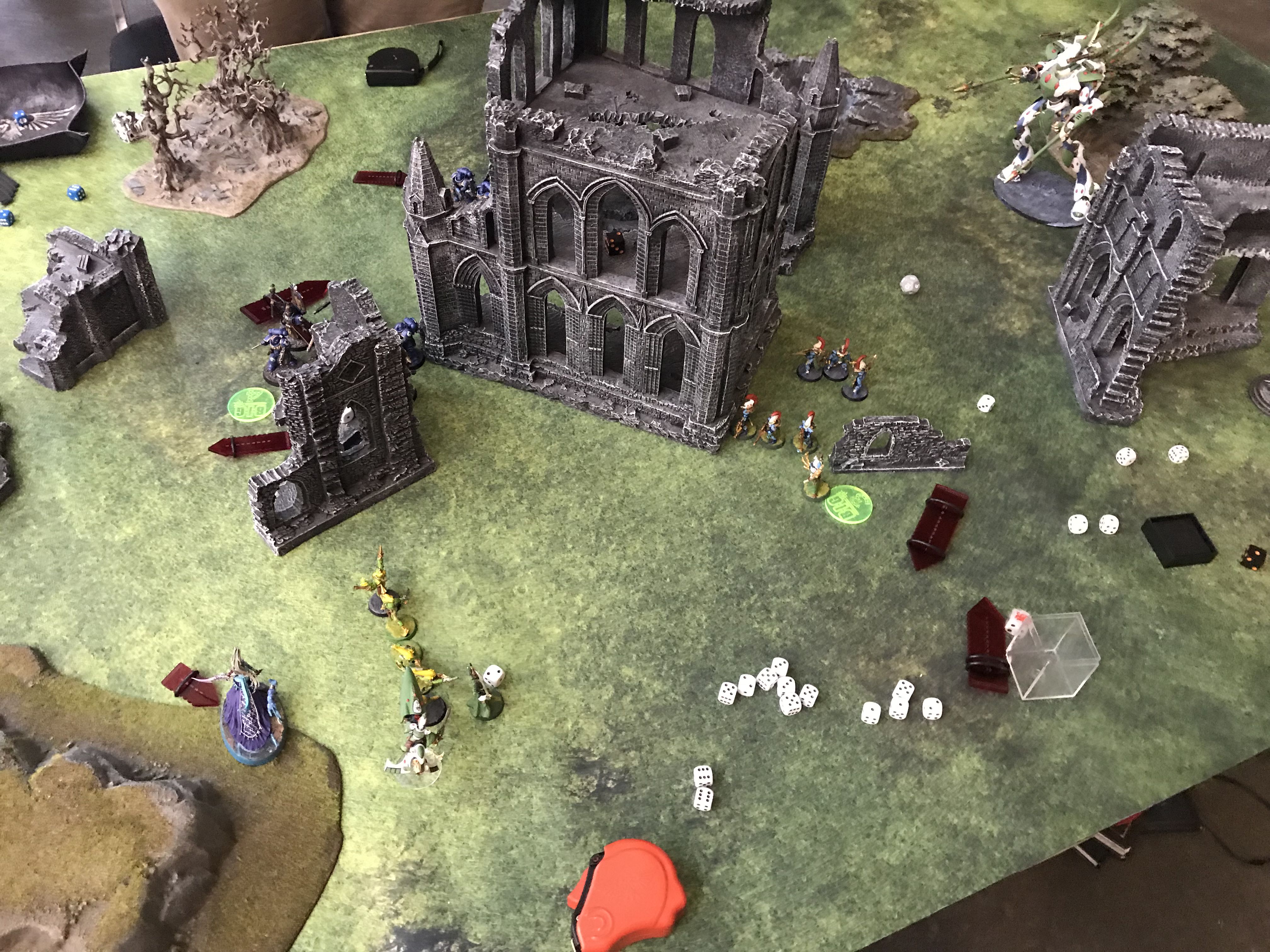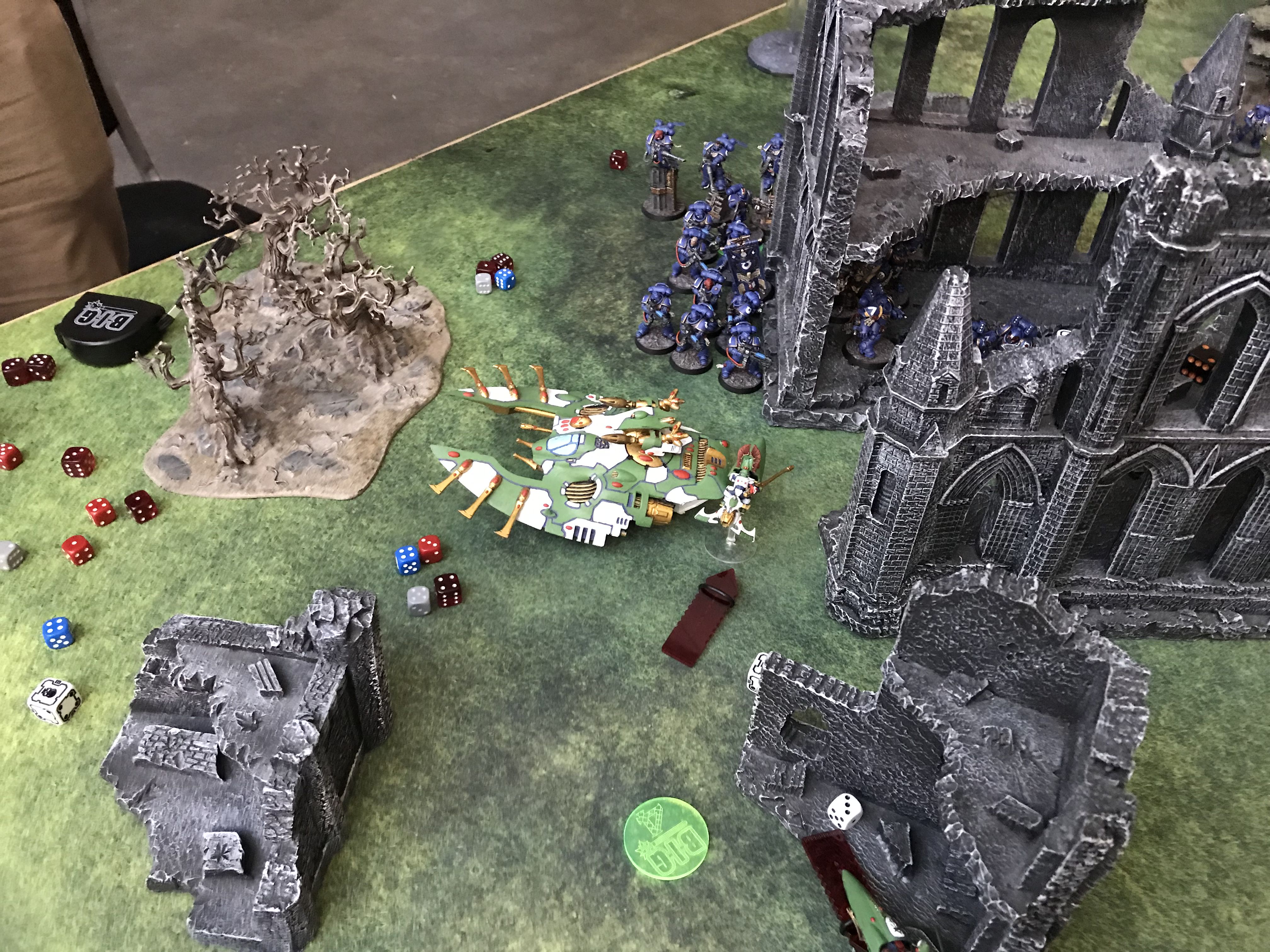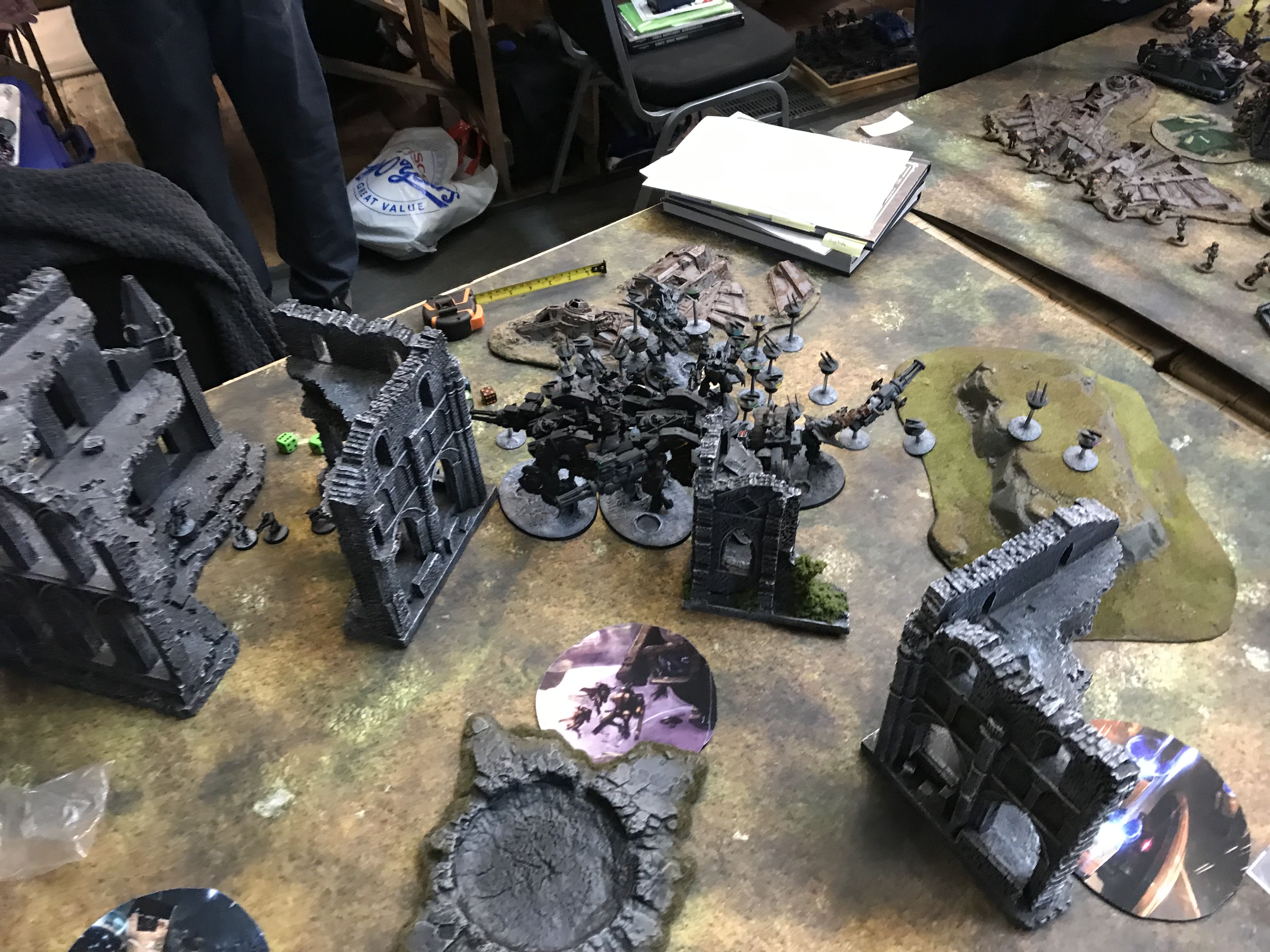 Facing down the Tau gunline (far enough back to force a move/shoot if he goes first).