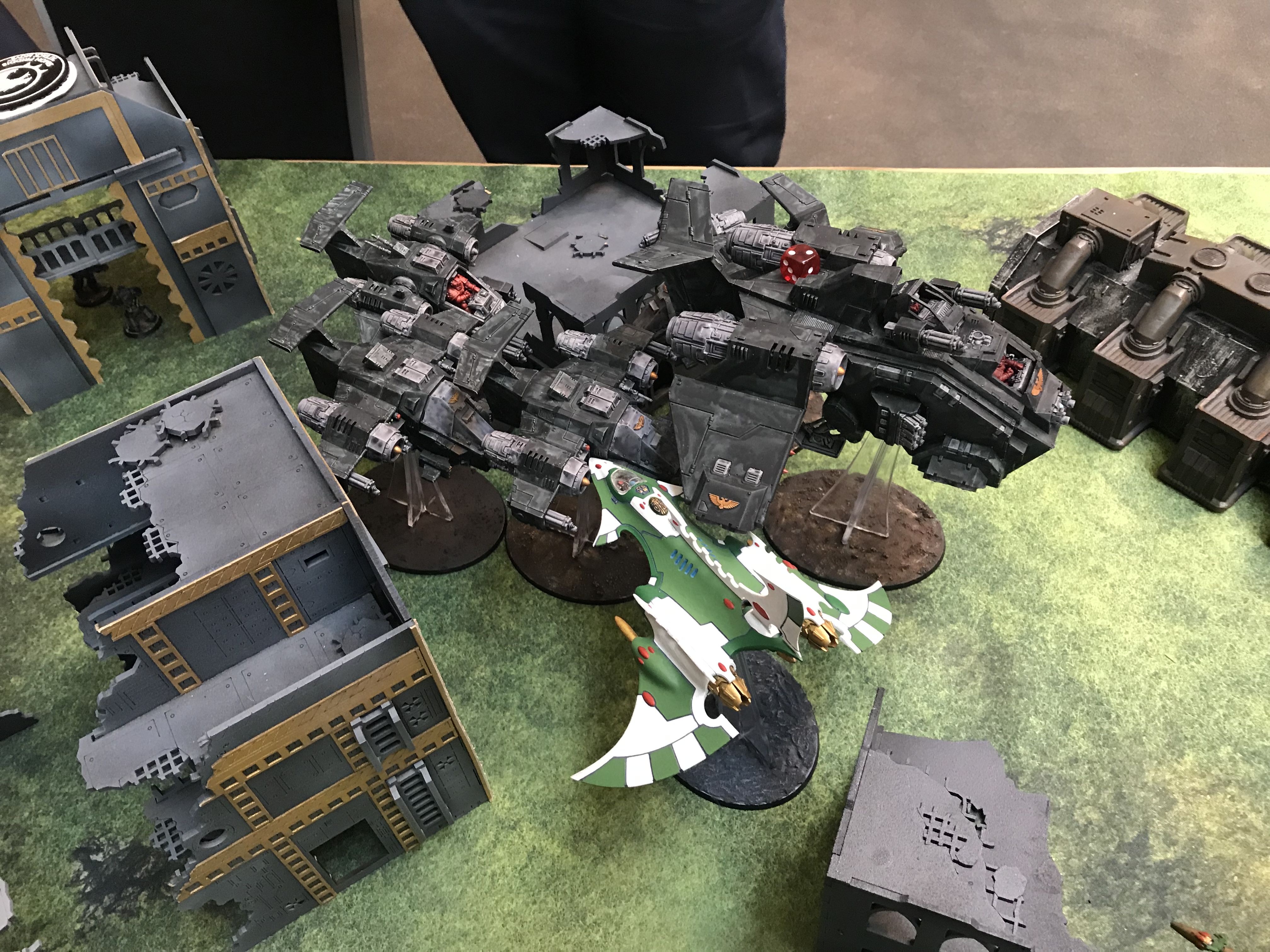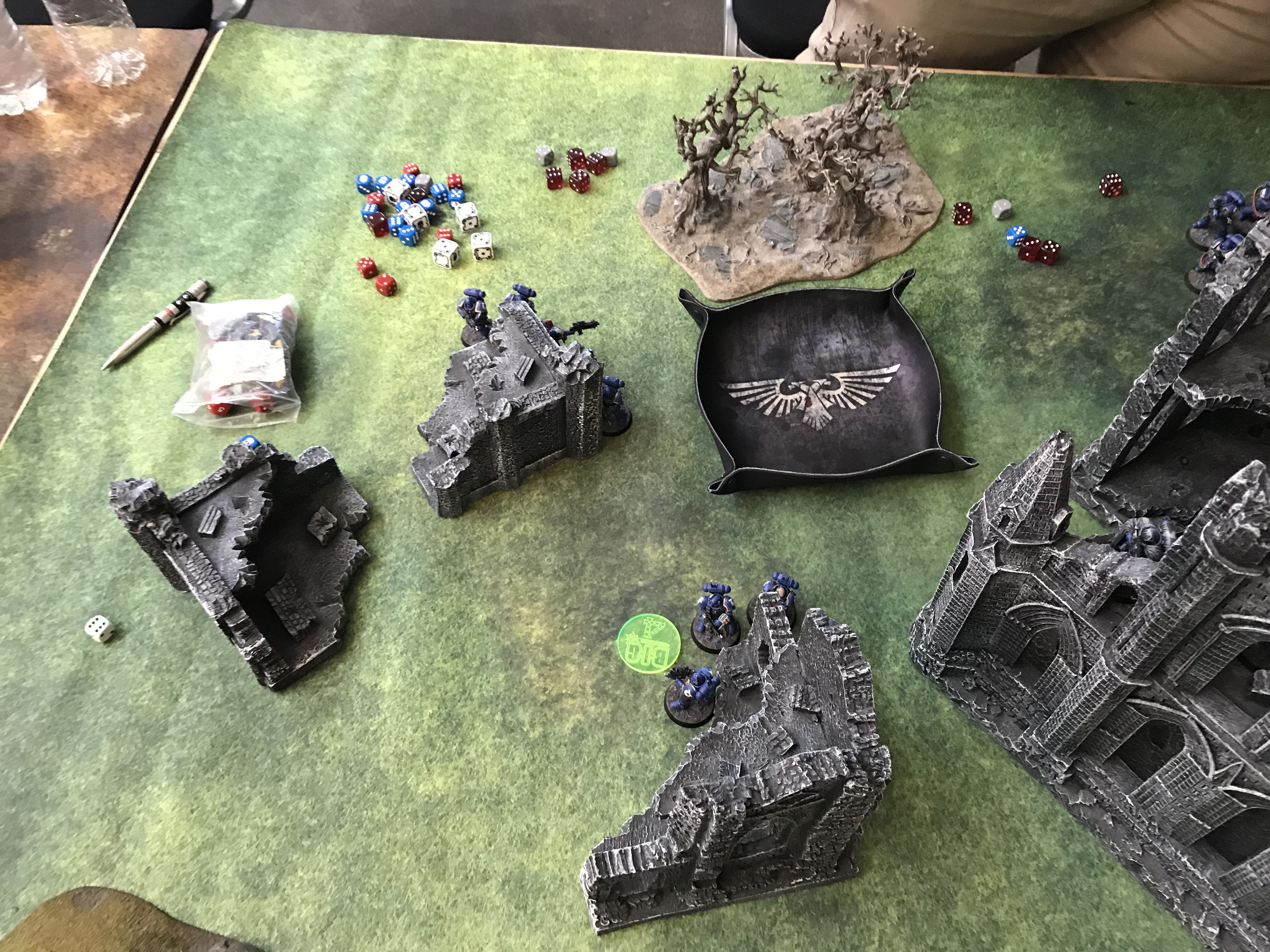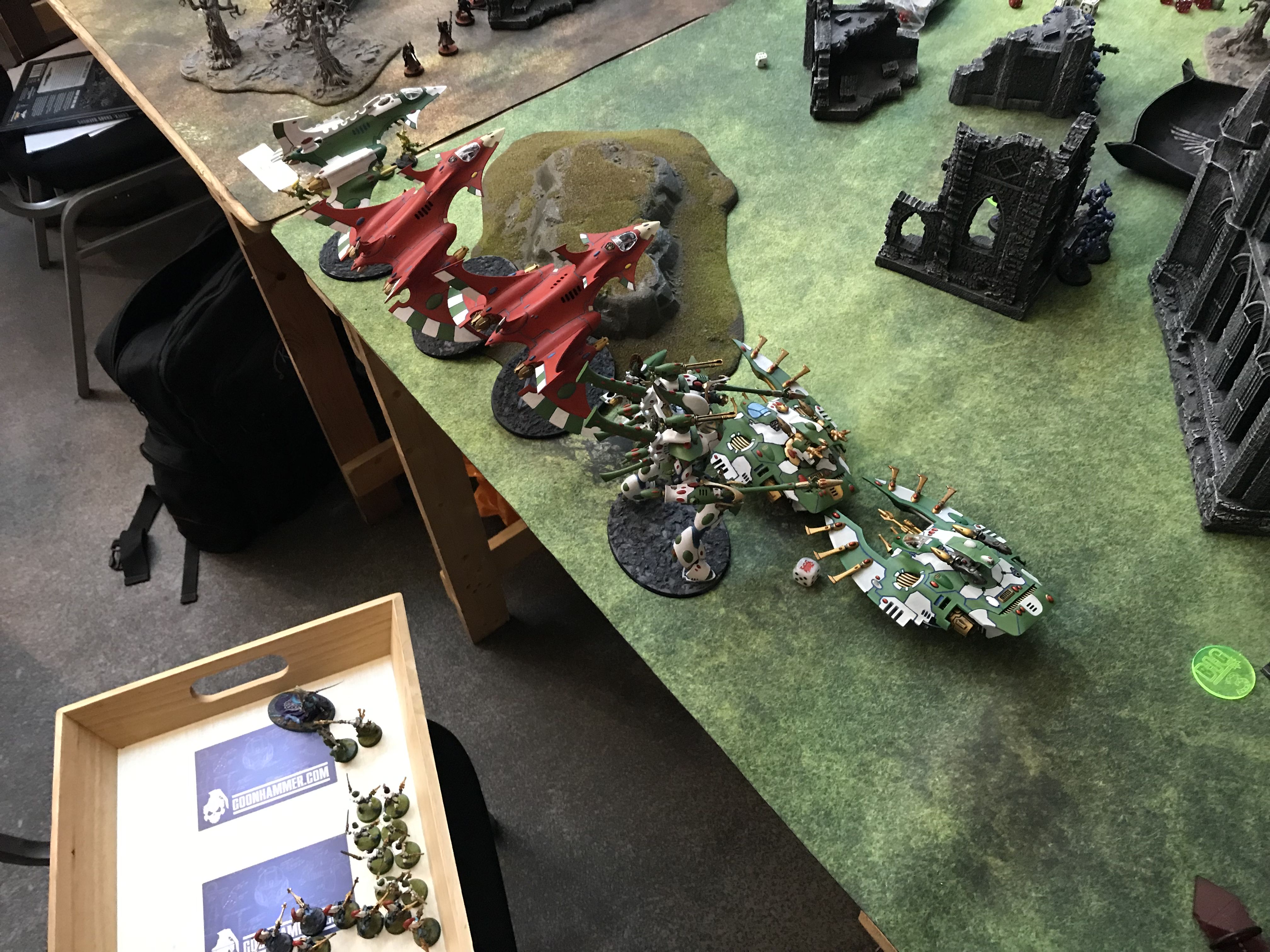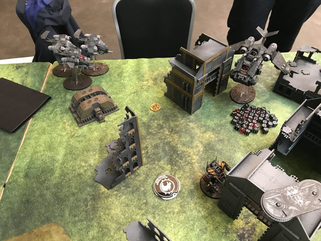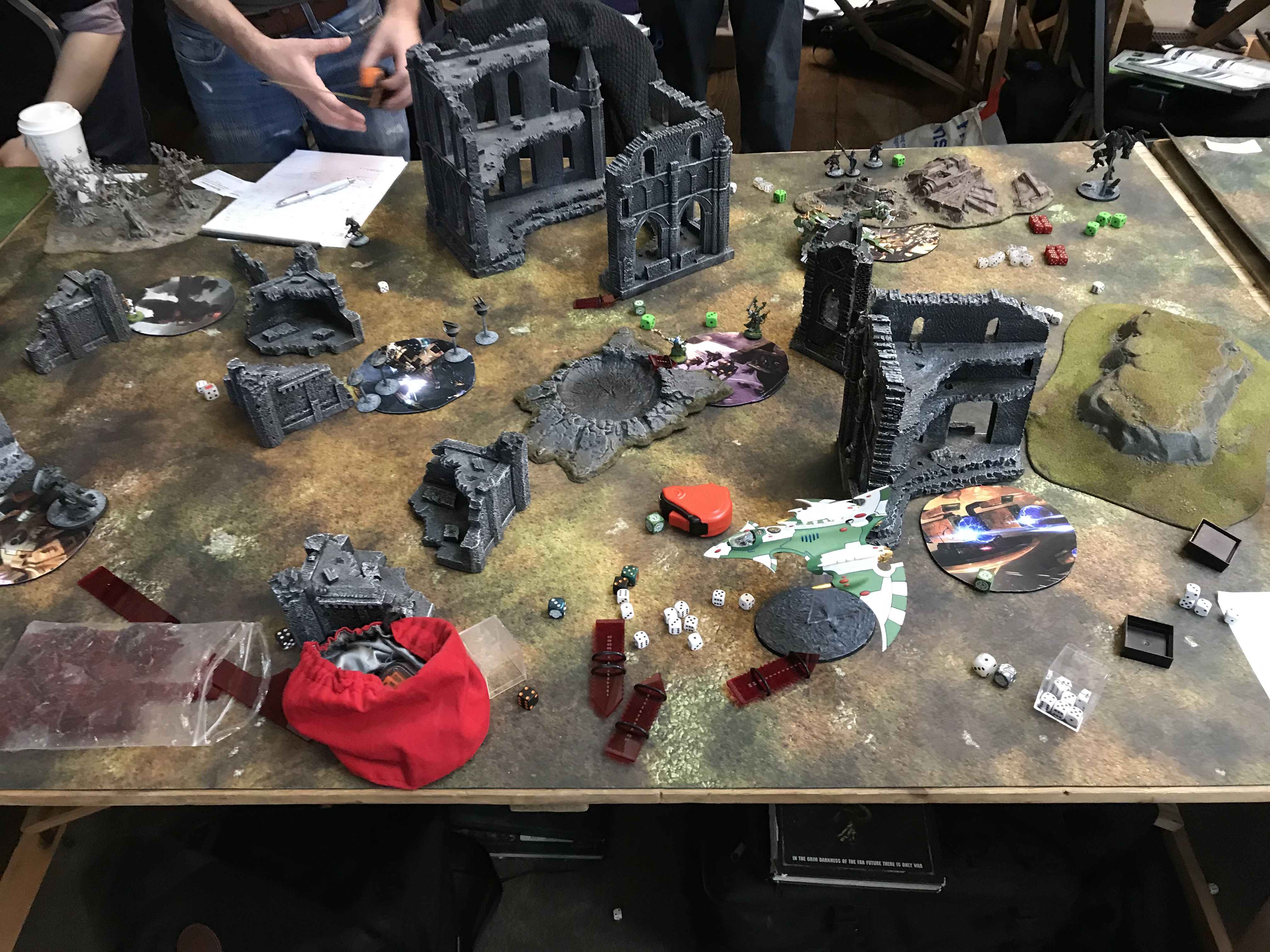 Facing down the Tau gunline (far enough back to force a move/shoot if he goes first).