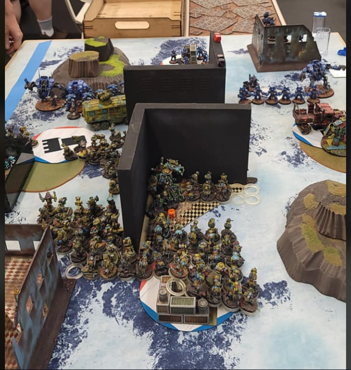 When he moved the Ares, he measured out the one place he could move to while not hovering (because of turn radius and minimum movement), so I ensured that I throw some Boyz there to force him either to go to Hover or leave the table. Everything advances forward (with the 4 Meganobz doing their best to get out of a forest, another mistake on my part), the Weirdboy starts to summon the Great Waaagh. His turn 2, one SoS squad comes on and Deploys Scramblers in the no mans land, the Shield Captain drops in behind my Boyz on my home objective. The Ares goes to hover and bombs again, this time deals 14 mortals (averages out from the first bad roll). The shooting eliminates 3 meganobs, a ton more Boyz, and deals 4 more damage to Ghaz (who got healed for 2 in my turn 1). My turn 2, I pop green tide on a unit with 4 models remaining, and bring it in behind the Shield Captain (who failed his charge the turn before) Ghaz moves closer to a Caladius, which is right next to the Ares. The closest squad of Boyz advances close to the Ares and the Big Mek comes along for the ride. The Weirdboy continues the chant. I land the charges with the Boyz on the Ares, Ghaz on the Caladius, and the Mek on both. The Boyz shave some wounds off the Ares, Ghaz somehow doesn't kill the Caladius, so the Big Mek picks up the Caladius and deals some more damage to the Ares (should have not worried about the Caladius since it can't fall back and shoot anymore, but I didn't think of that.) The Caladius auto explodes and deals 3 mortals to Ghaz, 2 to the Mek and 2 to the Boyz. I choose to fight again with the Mek, hoping to shave off the last 5 wounds from the Ares, but I only take it down to 2.