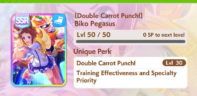 Baksuhin benefits from being fairly easy to train, as her career is generally nothing but Sprints and a few longer races; however, it is important to note that she runs a few Mile races, and that the variance in stats can sometimes make those a danger to your Career run if you don’t plan to inherit enough Stamina and/or have a recovery skill or two. If you are looking to make her a Pace Chaser, the Special Week SSR card is great, as it comes with Gourmand, a Pace Chaser Gold Recovery (which also means you can skip Swinging Maestro). If you do end up running a Stamina Card to get Swinging Maestro, Bakushin will certainly benefit from it, and her natural Speed gains will generally counteract any potential loss from Speed Trainings you shift to unlock the skill from Super Creek’s events.