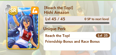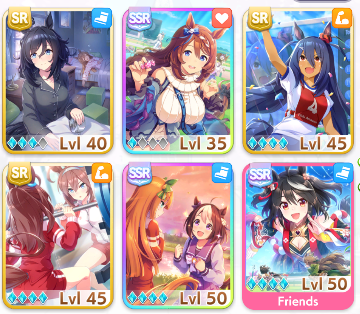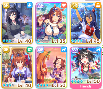 Mihono Bourbon’s SRs are all good choices if available. These cards provide generally beneficial skills (some of which are positional), but also have helpful events and good training stats and benefits. At the end of the day, you want a deck with four Speed and two Power of your best available cards; as a final beginner note, more Unlock levels are better than fewer, meaning an MLB Eishin Flash SR will be better than a 0LB SSR speed card; keep in mind what you have, and what you can use, when building your deck. SSRs aren’t always better just because they are SSR!