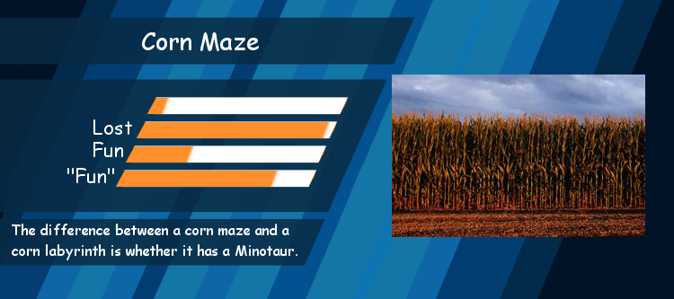 Here again I have a secret tip to help you on your way: don’t try to be smart. Be dumb. I acknowledged early on that I don’t know a dang thing about Mantii, including how to pluralize the word. Thus, if I already know I’m going to get the hint questions wrong, why waste time reading them? When I saw a question-slash-hint, I simply picked a random path, and went where it took me. I was navigating purely on Vibes. This did lead to a frightful number of wrong turns and doubling back, but the numbers don’t lie: I won, navigating the maze comfortably ahead of the rest of my team. You can absolutely bet that I was, and remain, a shithead about it to all of them. I may not have gotten a good look at any particular corn as I power-jogged by (running was not allowed), but I’m willing to bet I looked at the most corn.