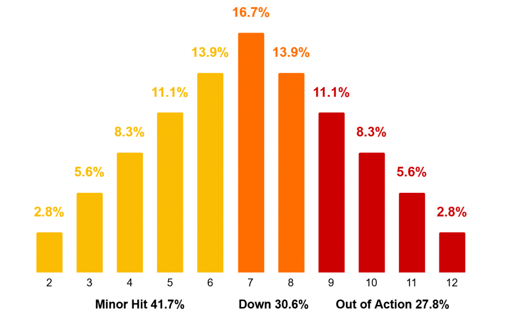 Last time we covered the basic 2d6 dice roll mechanic of Trench Crusade and the various ways it's normally modified. So far so good, right? So let's complicate things further by talking about the injury roll. An injury roll occurs after a unit makes a successful ‘killy’ action to see what the result of that action is. Whilst it uses the same dice math(s), we can’t 1:1 use the same framework to calculate probability for injuries as it’s a little bit more complex. Firstly, there’s more states to consider than just pass/fail, with three (or four) potential outcomes depending on what you’re trying to knock over. And secondarily we also have to account for more types of modifiers as well as things like Crits and Bloodbath. So let’s start simple.