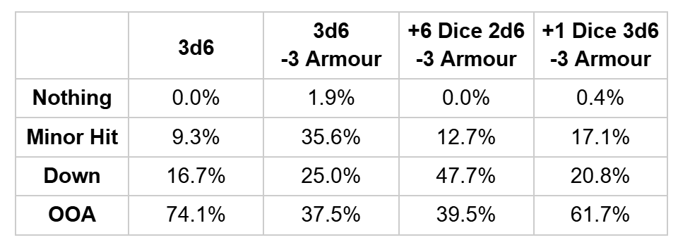 In short, -3 armour really fucks with the 3d6 probability curve, just nudging the crest of the curve into the Down result, meaning that, at least some of the time, if you’ve put six blood markers on a -3 armour model, you’re better off rolling a +6 Dice injury roll instead of bloodbathing for 3d6. HOWEVER if it’s a Crit, you’re attacking with a +1/+2 Dice Injury weapon, or you’ve somehow got seven Blood markers on a model and it’s still not down you should always take the Blood Bath; the impact of +1 Dice on 3d6 is significantly higher than the incremental increase from +6 Dice to +7 Dice on 2d6 rolls.