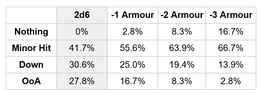 Just one Blood marker can have a massive impact on this table, most times doubling your chances of taking a unit OOA (however fractional), halving the chances of Nothing happening and generally boosting your chances of a Down result. But let’s be real for a second. Even using four Blood markers on -3 armoured units doesn’t give the same probability as a flat 2d6 of taking them OOA (26.8% vs 27.8%). That’s nuts. At this point you might as well save the markers and buy yourself a lovely…