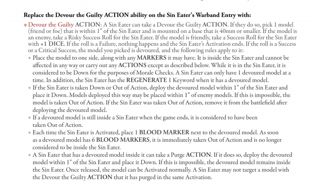 Like the Scripture Guardian, this is mostly a clean up of the current rule, but also a big of a buff to the Devour rule, allowing the Sin Eater to regenerate whilst it has devoured a foe.