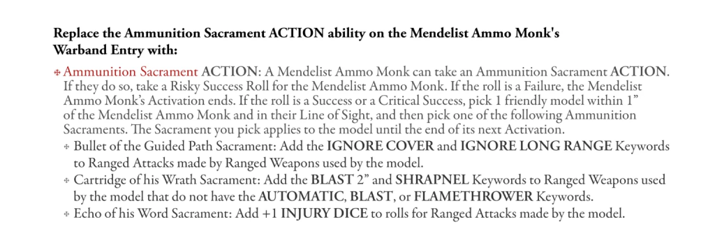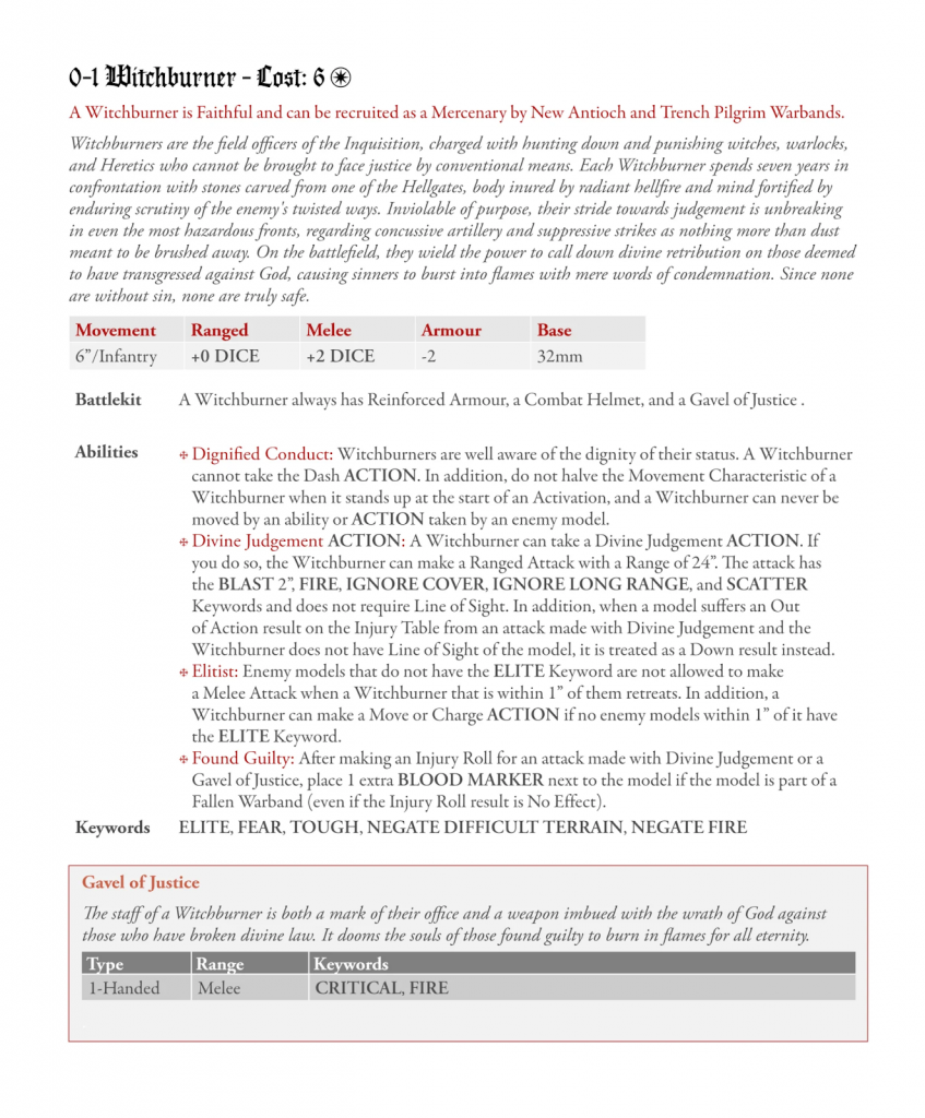 Rest in piss ammo monk, I think the new version is both going to be more interesting to play with and against. It still has the flavor of what an ammo carrier should do without just being a walking piece of equipment for your big gun. I can see some merit in the Witchburner now, I still think it’s a bit pricey but it’s better for your buck and can be really handy against rosters with a bunch of chaff. The other stuff is mostly quality of life, but I do like the Sin Eater being rewarded for playing more aggressively rather than just being a meat wall for your own guy.