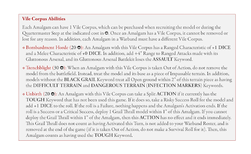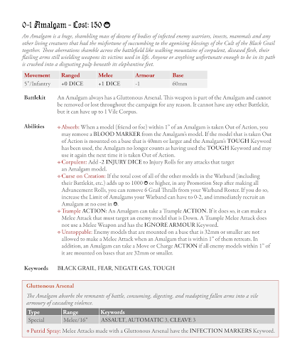 Norman: I think the Amalgam profile change is a slam dunk. I’ve run a couple test games with it at this point (one with a single Amalgam and one with two at 1k Ducats) and it feels like a really useful anvil piece in your toolkit now. I’m less sold on the Amalgam strains though personally. I think a lot of these are trades and make an already expensive model that much more expensive. The ranged bonus removes your ranged bonus and ASSAULT but your Infection markers still happen in combat and you won’t really be able to take advantage of Trample either. The Trenchblight upgrade seems very strong in theory, but with such a slow, big, model I can see the terrain piece it leaves behind being more of a nuisance than a benefit for you. Lastly generating a thrall is very strong, but you’re shedding your TOUGH for it. I think that one is the most attractive because it can be planned around, but a vanilla Amalgam is probably where I’ll default to.