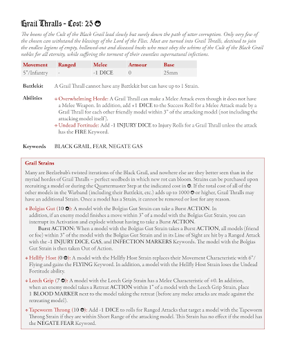 It’s not just the Amalgam that gets all the fun! Grail Thralls have always suffered a bit of a crisis in that they are all the same low cost model. To add a bit of diversity, each Grail Thrall can have one of the following Grail Strains: