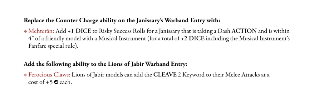 The final proposed change is just a few small changes on unit abilities, namely the Janissary and Lion of Jabir. For the former, we get the Mehterân ability, which is the same as the Janissary Veteren ability we saw on the Yüzbaşı. The Lion of Jabir get a nice little upgrade in the form of Ferocious Claws, which for +5 Ducats the Lion gets the CLEAVE 2 keyword.