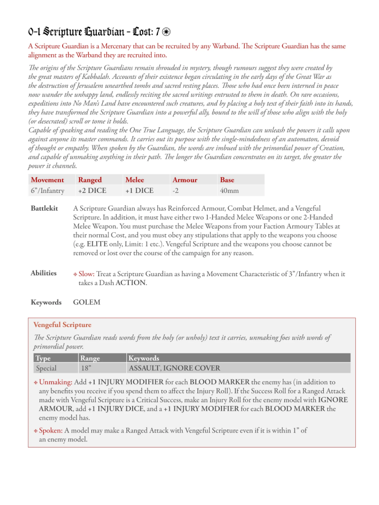 Dandy: Let’s be honest, the Observer was just overperforming, and this change, whilst painful, is something that just needed to happen. Being able to contribute to the game in an extremely effective way whilst simultaneously standing on a back objective was just way too good. For the rest of the faithful Mercs, the AT Hunter and Ammo Monk get a nice, albeit maybe not necessary buff, as you were taking the +1 to Attack Success Roll normally, but still losing the -1 to long-range and an extra -1 for cover. Now you’re pretty much going to be shooting your AT at the standard +1 always.