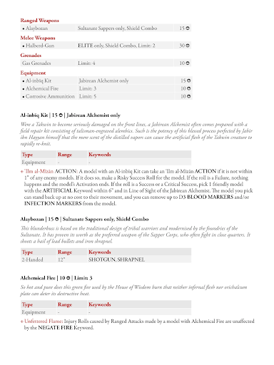 The first proposed change doubles down on one of the faction's more distinctive aspects: Unique armoury. Whilst New Antioch has a breadth of possible weaponry, the Iron Sultante have both breadth and uniqueness, where much of the Battlekit can only be found in this faction.