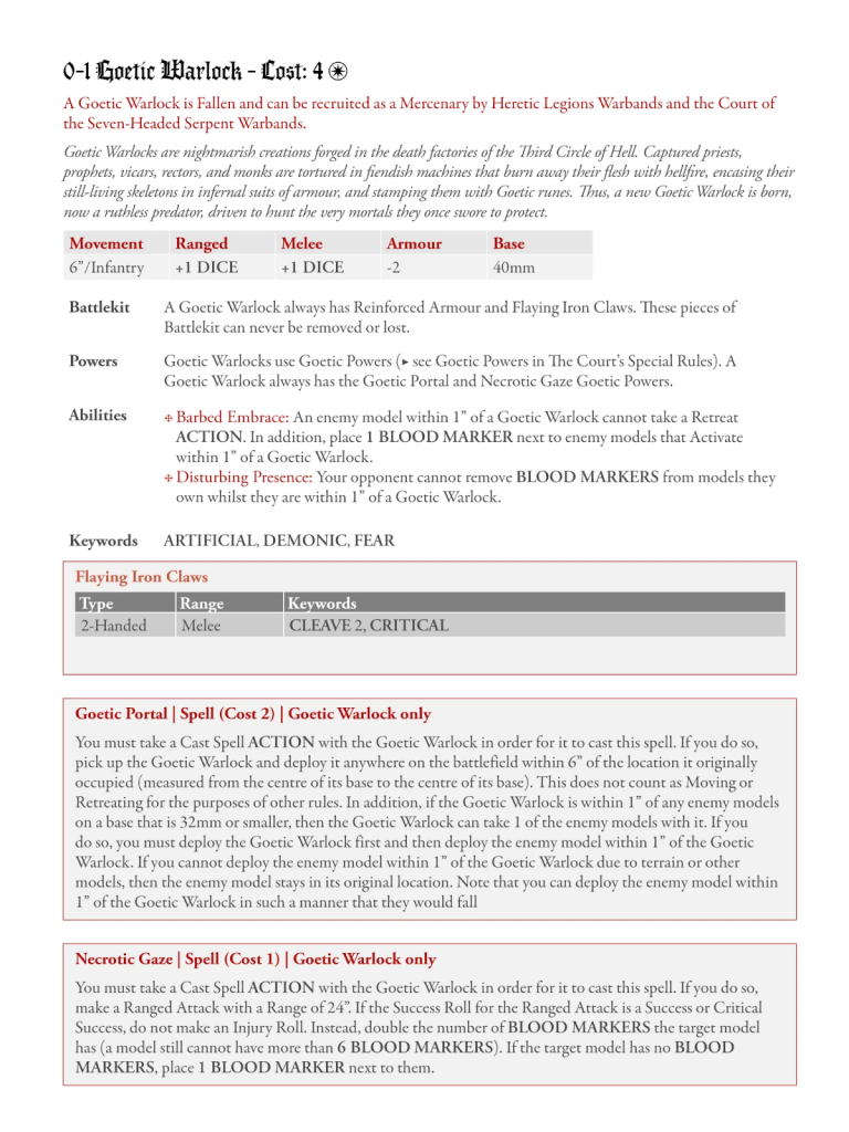 A very welcome glow-up for the Warlock, as it can now use a number of Goetic spells on the battlefield, playing perfectly into the Court’s game, as well as adding some Goetic flair for the Heretics. Along with that, we see some weapons changed and a nice ability which limits healing for enemy units in combat with the Warlock.