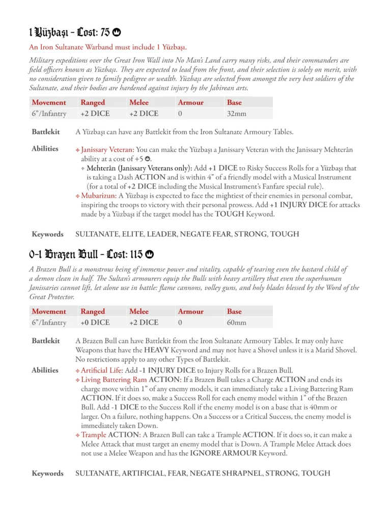 The Yüzbaşı is getting a small change, essentially giving them the STRONG keyword innately, as well as giving them the chance to get the Janissary Veteren upgrade for just +5 Ducats. For the Brazen Bull, they get a chonkier update, given their beefy status. Here, the changes refine how the Bull plays, namely a tanky bruiser that your opponent needs to deal with, or else it runs rampant on the battlefield. Here are the two new profiles: