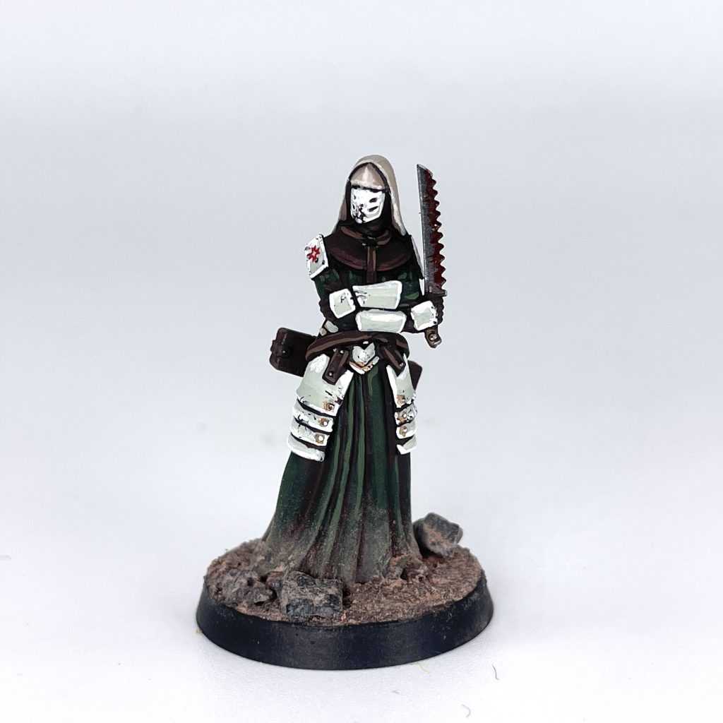 Across the front lines of any battlefield are the heroes who focus on healing the wounded and ensuring their survival, if only for a bit longer. The Sisters of Saint Cosmas are the medical specialists of the faithful, who stabilise and heal soldiers, sending them back out once fixed up, so they can continue the fight against damnation. However, not all receive the grace of a sister’s gift. Any heretical force instead faces the Sister's blade, which serves as both a misericordia and a surgical knife.