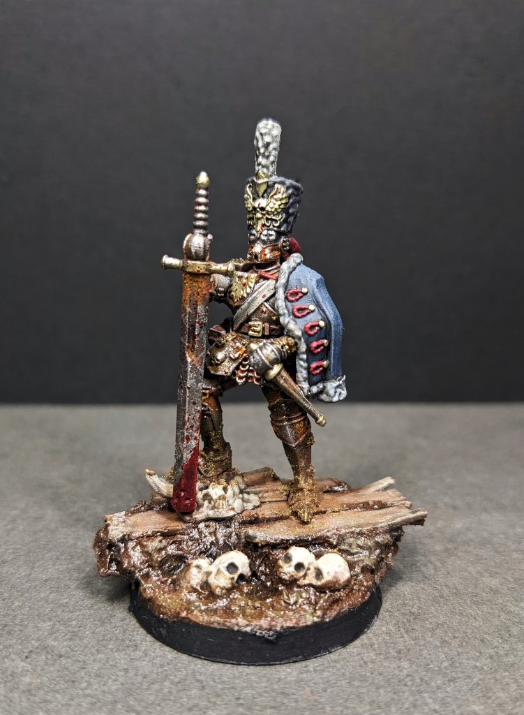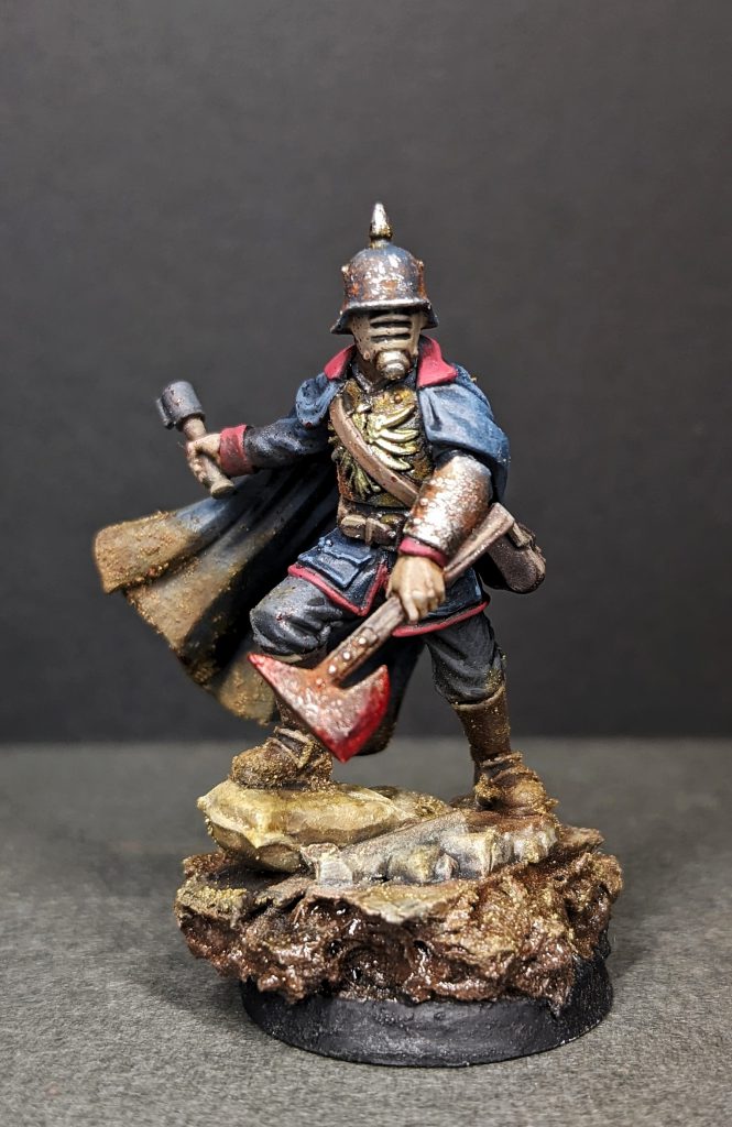 Dandy: What I really liked about the sculpts when painting them was how easy they are to paint in both a grimdark or a more traditional “cleaner” style. There are enough details in the models that you can pick out and highlight if you wish, but not enough to overwhelm you as a painter, making you feel forced to pick them out. I chose the Hauptmann and the caped Stoßtruppe as models to test out. For the Hauptmann, I opted for the iconic aura pose, using only the Tank Splitter Sword, as seen in the Artwork. I initially feared there wouldn’t be enough detail to work with if I opted for this pose, but I was pleasantly surprised to see that there is potential to really show off more of the details, if you so desire. At the back, there are satchels, grenades and a pistol holster, as well as some pauldron details that aren’t initially present in the product photos. After a zenithal prime, I went right to work covering most of it in metallics, opting for Heavy Metal from Army Painter. Even though the model is 85-90% metallic, there are enough rivets, edges, and whatnot for it not to be boring to paint, and whether you want to go for a clean battle suit look or dirty it down with rust and filth, it’s easy to do with this sculpt. There are no finicky parts to get to or require some finger yoga to access. It’s a clean, easy-to-paint sculpt that lets you paint grimdark or clean, with lots of possibilities in between. The Stoßtruppe similarly has no complex or hard-to-reach parts to paint, and offers a good range of fabrics or armour pieces to pick out details and differentiate everything cleanly, or unify it more in a grimdark style paint job. The cloak, especially, is a big focal point that highlights this design idea. You can easily paint it cleanly with lovely smooth blends, or rough it up with mud and dirt, using drybrushing.