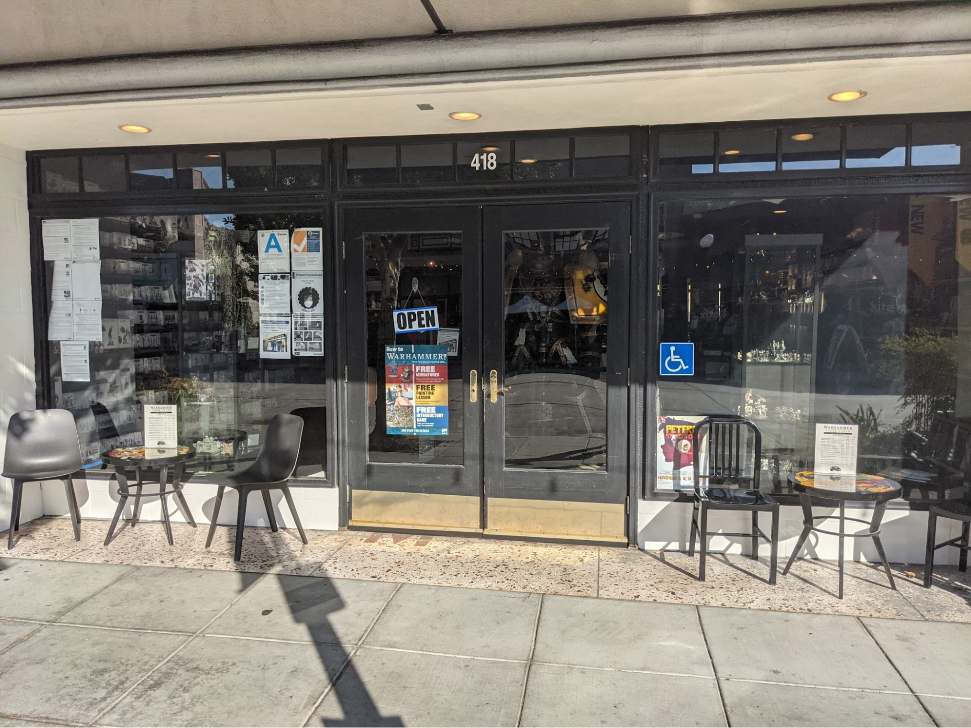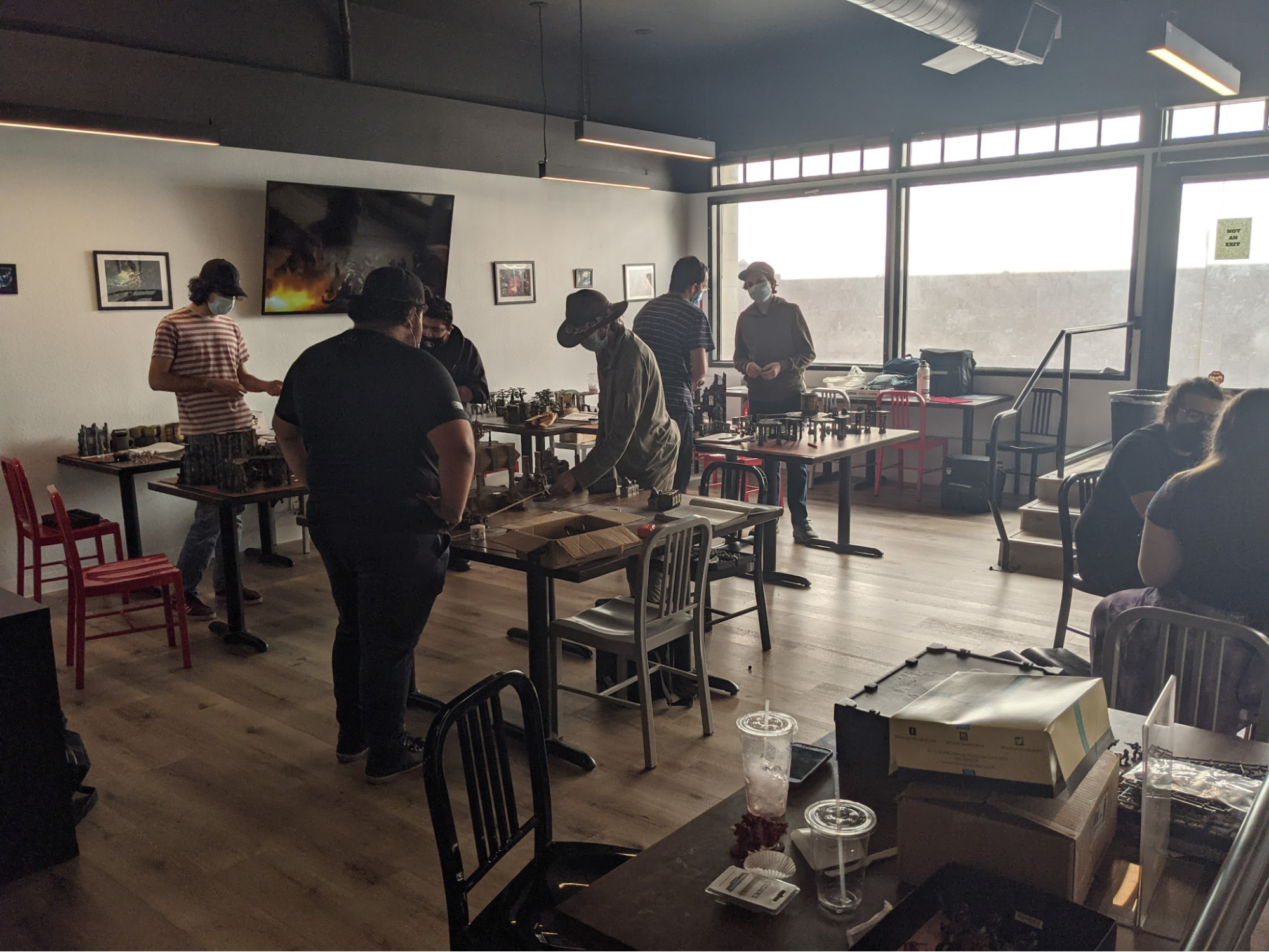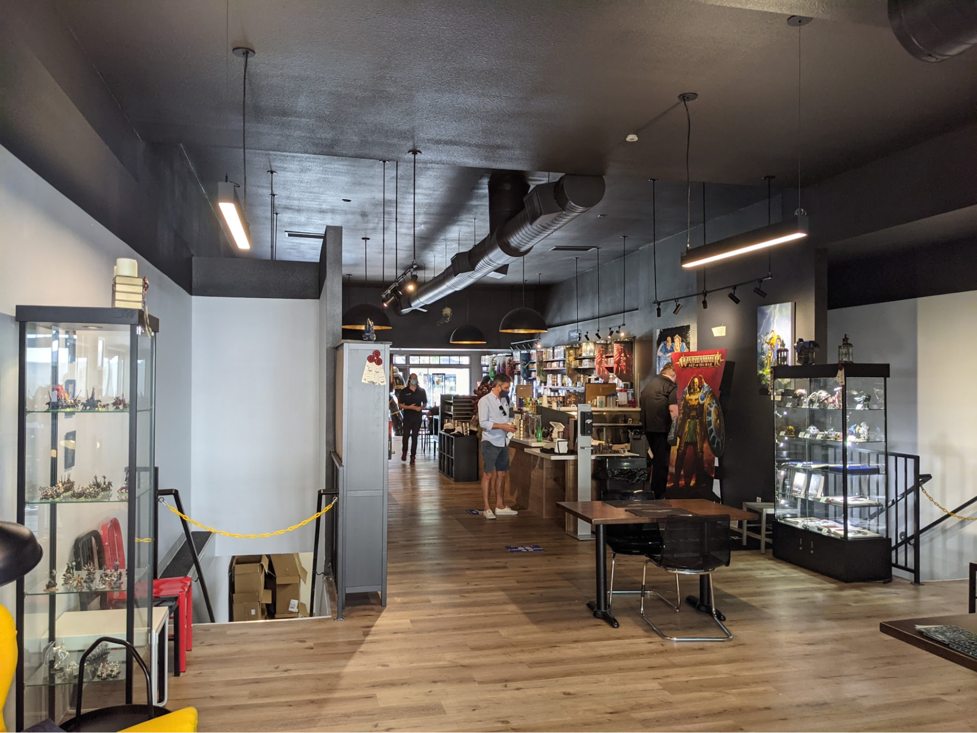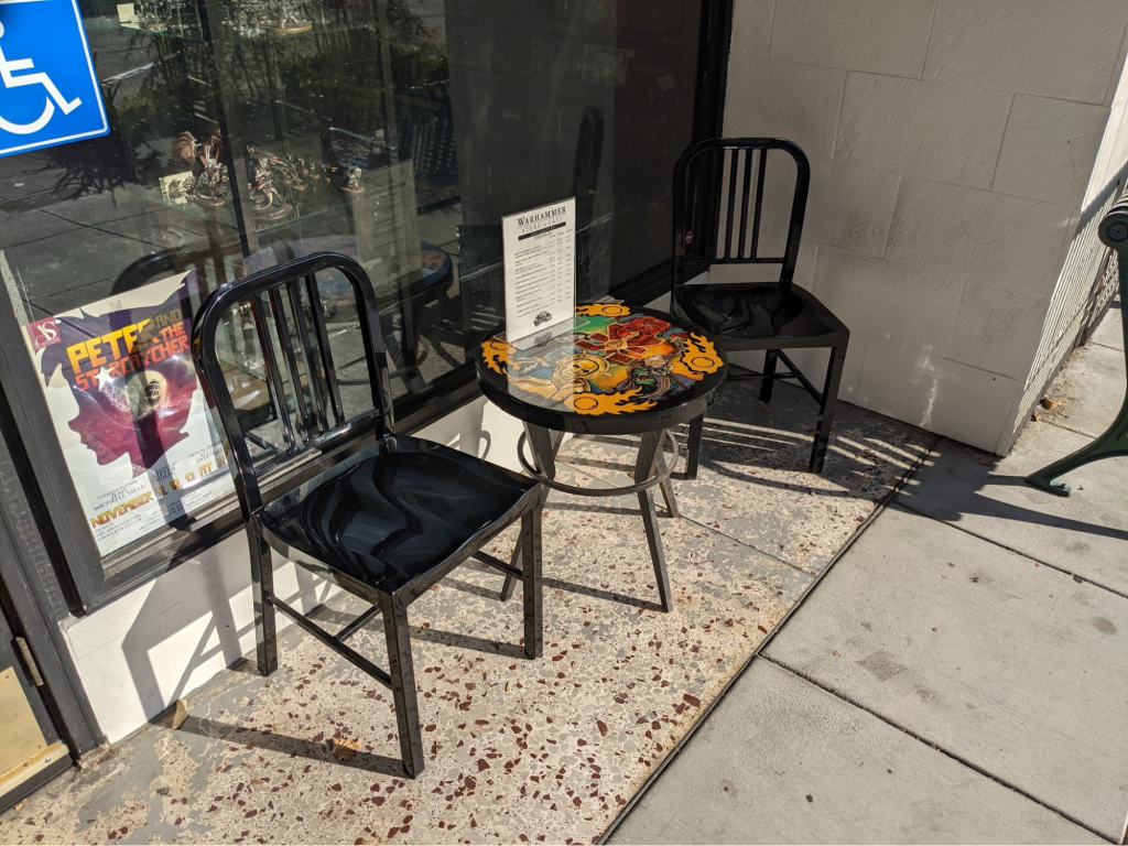 In the back of the store are some more hobby tables and a few game tables. There’s not too much to say here, either. The lighting from the windows in the back is nice and makes the area feel a lot more comfortable. The tables and terrain look like pretty standard GW store stuff. It would have been cool to see some unique or weird terrain for the store but I guess the tables need to be played on, not gawked at. I was surprised that the tables were so close together, especially with the pandemic and all, but I guess this is to keep the gaming space from creeping into the café area. There is also some space outside the back of the building, which I would love to see used some day.