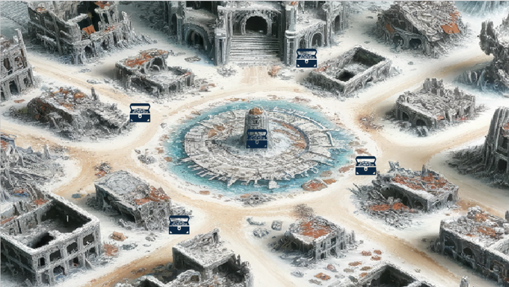 treasure tokens around the board: a central treasure, which is potentially worth more, two that are quite close to each player’s deployment area (participation trophies, if you like) and two elsewhere on the board. Each mission will have different spins on this though.
