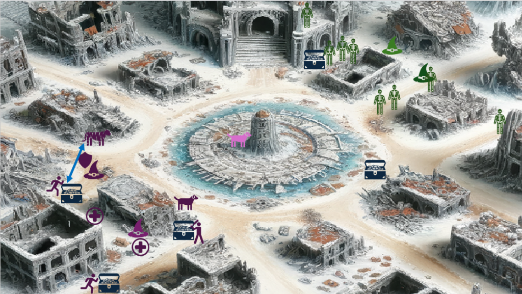 I then moved both apothecaries towards my wizard, one of whom could get there within one move, enabling him to give my wizard a healing potion with his second action. The other just moved and moved again in order to give the wizard the potion next turn.