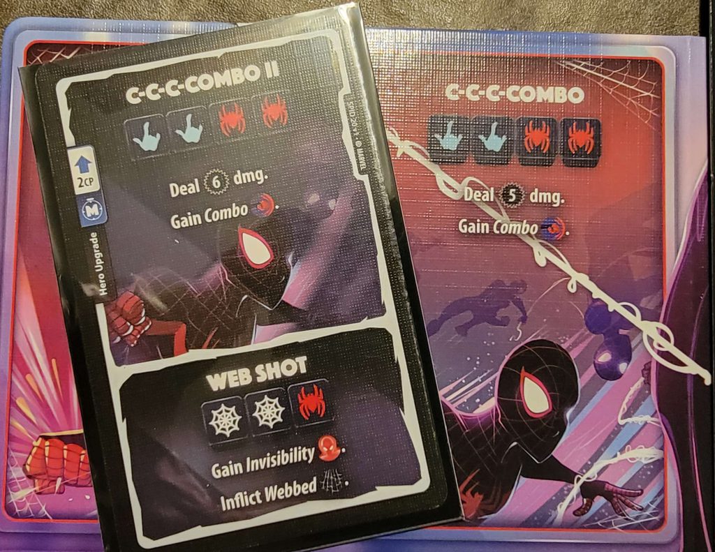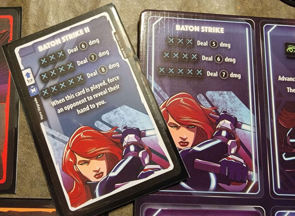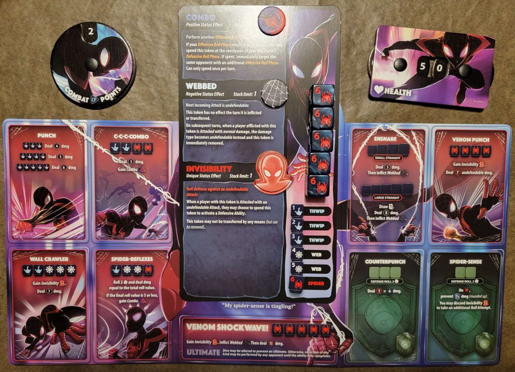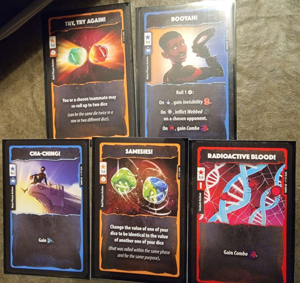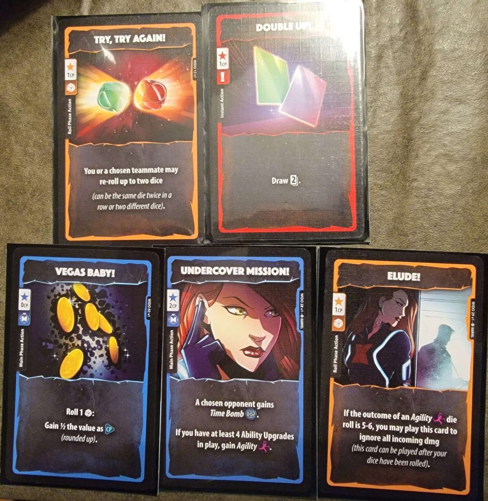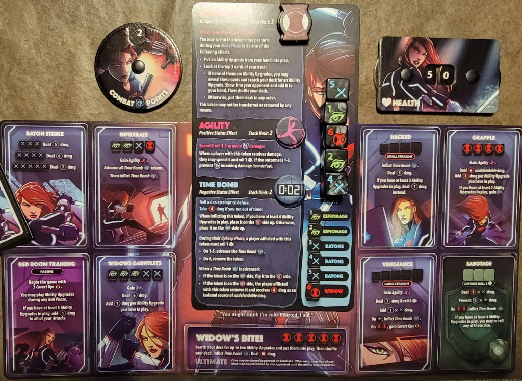 The setup is quick and easy, and the gameplay is very simple to learn. A player’s turn consists of several phases: Upkeep, Income, Main 1, Combat, Main 2, & Discard. To anyone who has played any TCG, or LCG, this will all seem very familiar. If you haven’t though, there are helper cards in each character pack to remind you. In the Upkeep Phase, certain effects may trigger (like bombs placed on you by Black Widow). The Income Phase is where you will draw a card from your deck into your hand and gain 1 CP (Combat Point). Main 1 is where you can spend CP to play cards from your hand, as is Main 2 after combat. The Combat Phase is where most of the action happens! In it you will roll your 5-custom dice, rerolling any you like up to twice (much like Yahtzee) in an attempt to get certain combinations to power your attacks. Once you have settled on which attack you will activate off your Hero Board, you declare the results to your target. They then have an opportunity to roll a single Defensive roll (unless your attack is of “Undefendable”, “Pure”, “Collateral”, or “Ultimate” damage), and apply its effects, if any. Lastly there is the Discard Phase where you can discard cards to gain CP and must do so if you have more than 6 in your hand. Play alternates around the table until only 1 Hero is left standing.