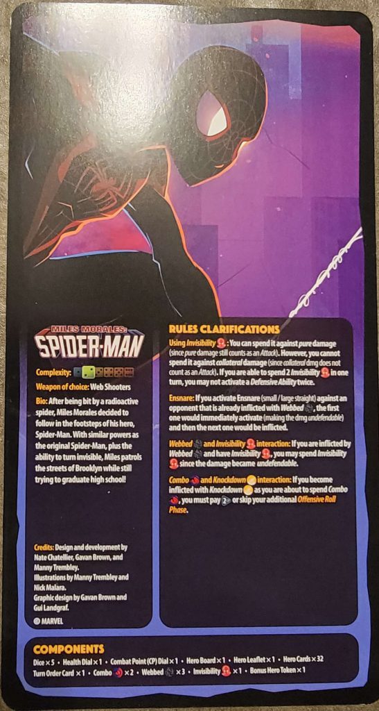 Each Character packet includes a Hero Leaflet which explains any special rules for that Hero, what faces each of your dice have, any rules clarifications, a list of components in the packet, and my favorite detail: the Complexity rating for that Hero. This feature is so very helpful in that it lets you know immediately if that Hero is going to be right for a new player or not. I honestly wish more games included such a consideration.