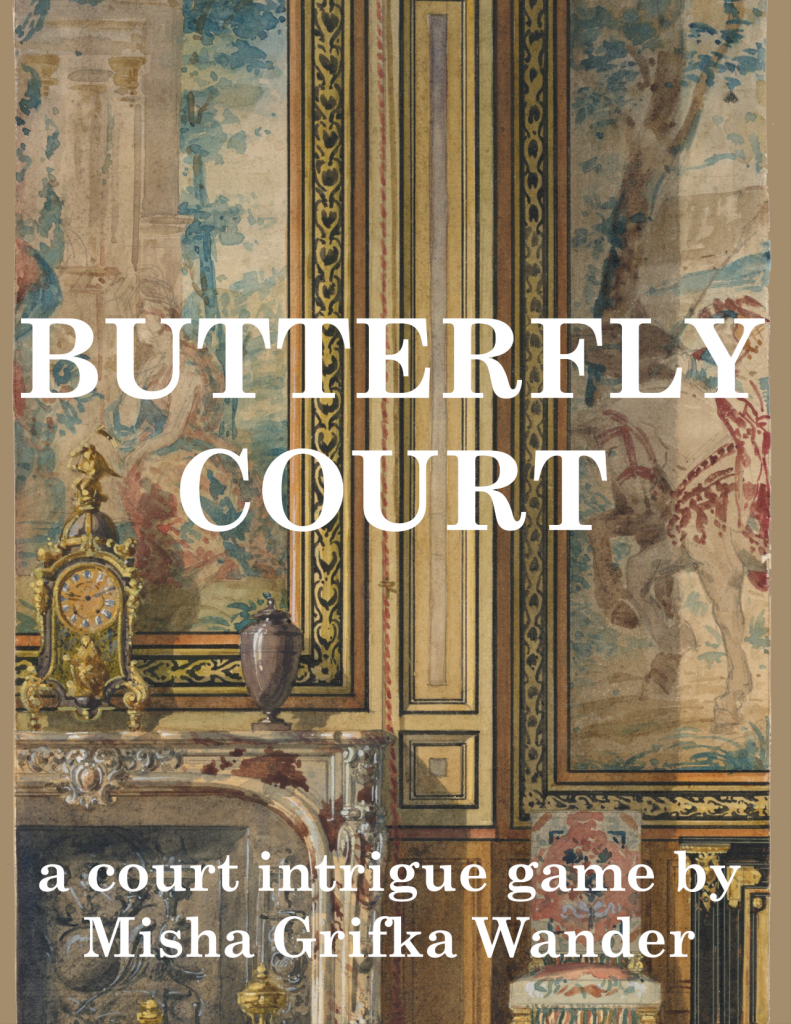 “Butterfly Court” is a court intrigue game, perfect for anyone who likes a little drama and gossip without real-life repercussions. It’s about the smaller players in a court who need to maneuver complex social interactions to gain traction for personal and political goals. Players work together to choose a conflict and then pick opposing Factions; it can be as important as which heir to the throne to support or as light as whether astrology or tea leaf reading is more effective. Either way, the story will still be backed by some pretty serious threats to the kingdom like a curse on the royal family or an ongoing drought.