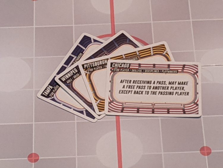 You can also choose an Arena Card which gives a special rule to both teams, one for each NHL city (including Seattle, thus saving our friends in the Emerald City from the terrible fate of Vancouver fandom). Each of these cards also includes a suggested set of four Line Cards that are themed around that city’s NHL team. Boston is