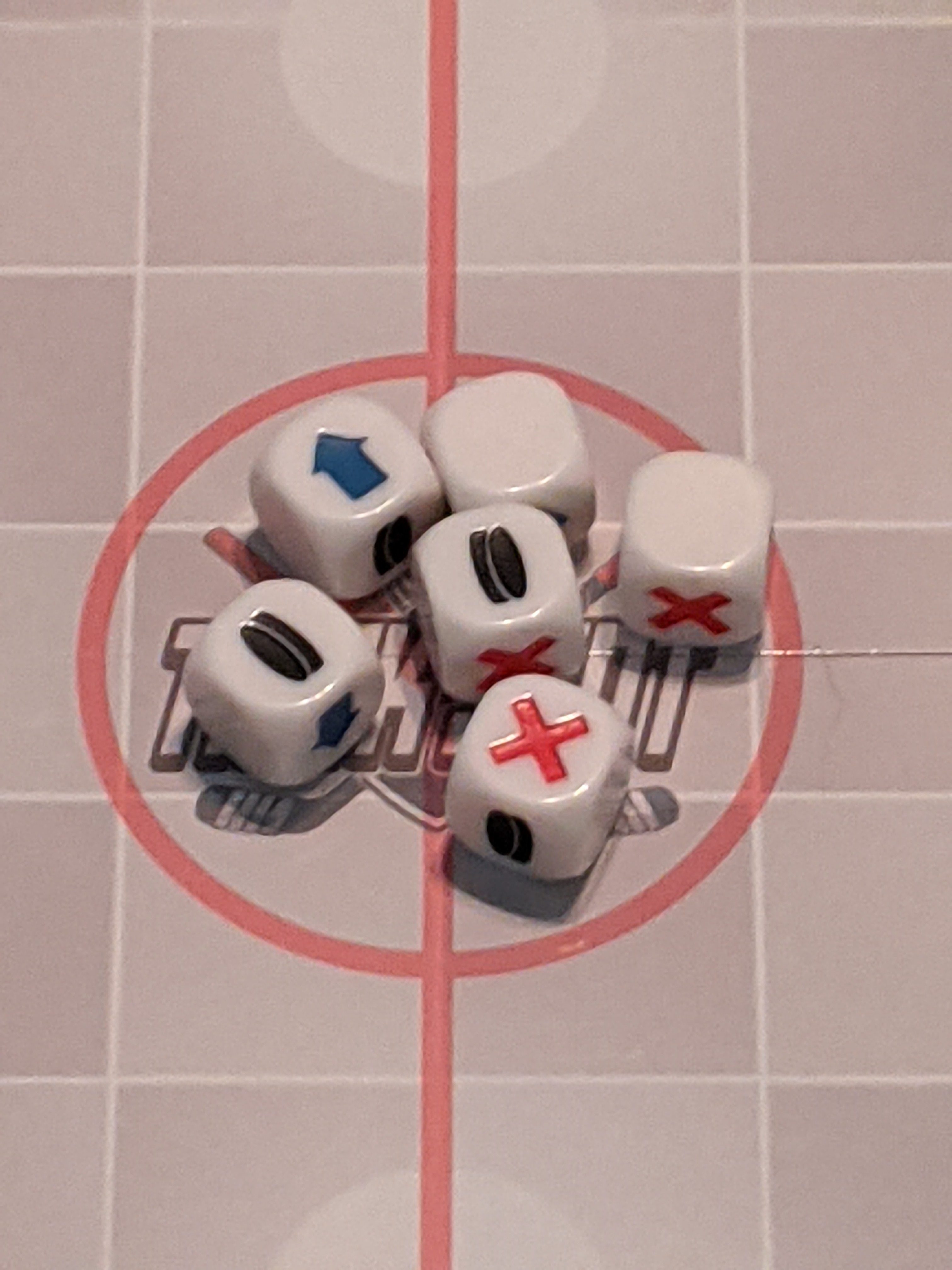 The dice-based nature of the game means it can be pretty swingy. Quick goals aren’t uncommon – due to the geometry of the initial setup, scoring within 5 activations of the face-off is possible with a little luck. It’s pretty unlikely – you’re more likely than not going to roll at least one X or reaction starting on your 3