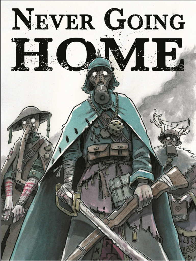 In my experience, Never Going Home by Wet Ink Games captures this narrative in a manner that few others even approximate. Set within a version of World War 1 where the veil between madness and reality grew painfully thin, players portray individuals within a unit of soldiers. When those first individuals lose themselves, whether to madness or violence, the player simply assumes the role of another within the unit, and the story proceeds. The mechanics (and the +ONE system itself) are tailored to encourage this terrible fatalistic momentum in every aspect of the game, begging at your players to burn their characters like tinder to keep everything going for just one more moment.