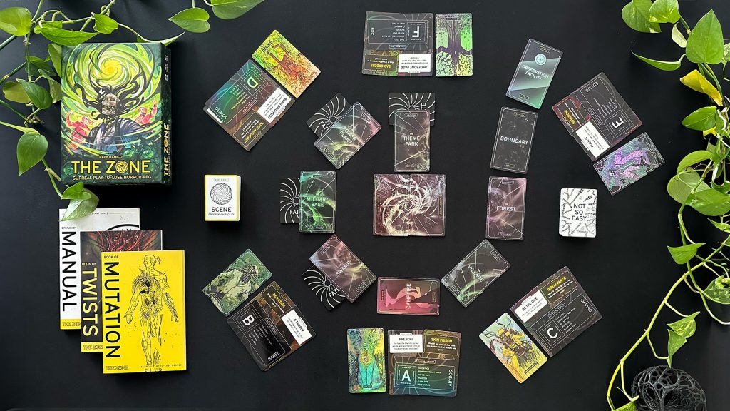 Once players make characters structured from some classic sci-fi tropes, they lay cards in a spiral, then flip them one by one to reveal options for prompts to describe each new location. Players take turns as the “director” of this “movie,” describing a few scenes at each location while also playing their characters in the world. “Fate” cards, placed at random on top of the location cards, mark the points in the story at which characters will die, but you don’t know who dies where until you get there. However, you also can’t die until you get to your card. If you attempt a difficult action, you’ll have to draw a “not so easy” card to see how it goes… and there’s a very big chance the zone will mutate you in some way, mentally or physically. The tables to figure out how you mutate are fantastic, and it will happen more than you think.