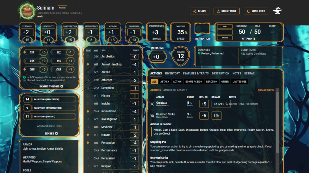 Look at all those easy-to-read stats for this perfectly normal character! (DnD Beyond Character Sheet; Wizards of the Coast 2022)