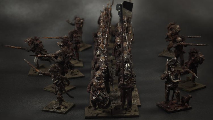 Max: I guess I’m trying to get the theme of almost like crusader columns, so you get that flavour to them, where they’re all heavily religious, not mindless, but they’re incredibly dedicated. But they’re also like a parody almost of Napoleonic regiments. So while a Napoelonic battalion might have hundreds and hundreds of men all brightly coloured, trained in lockstep, facing down cannonballs, it’s instead maybe two dozen guys marching through a swamp proudly waving banners and thinking they’re great. And thinking they’re this historic regiment spanning back thousand of years, even though they maybe dug up an old banner from a bog that no one really cared about.